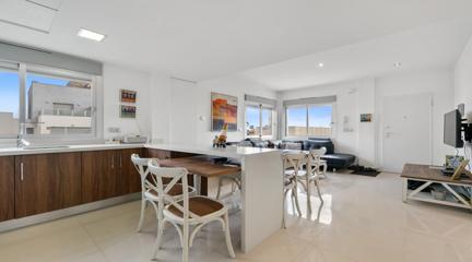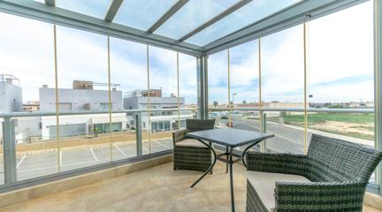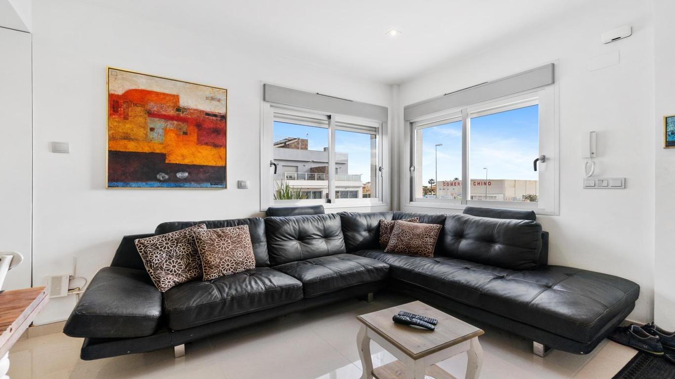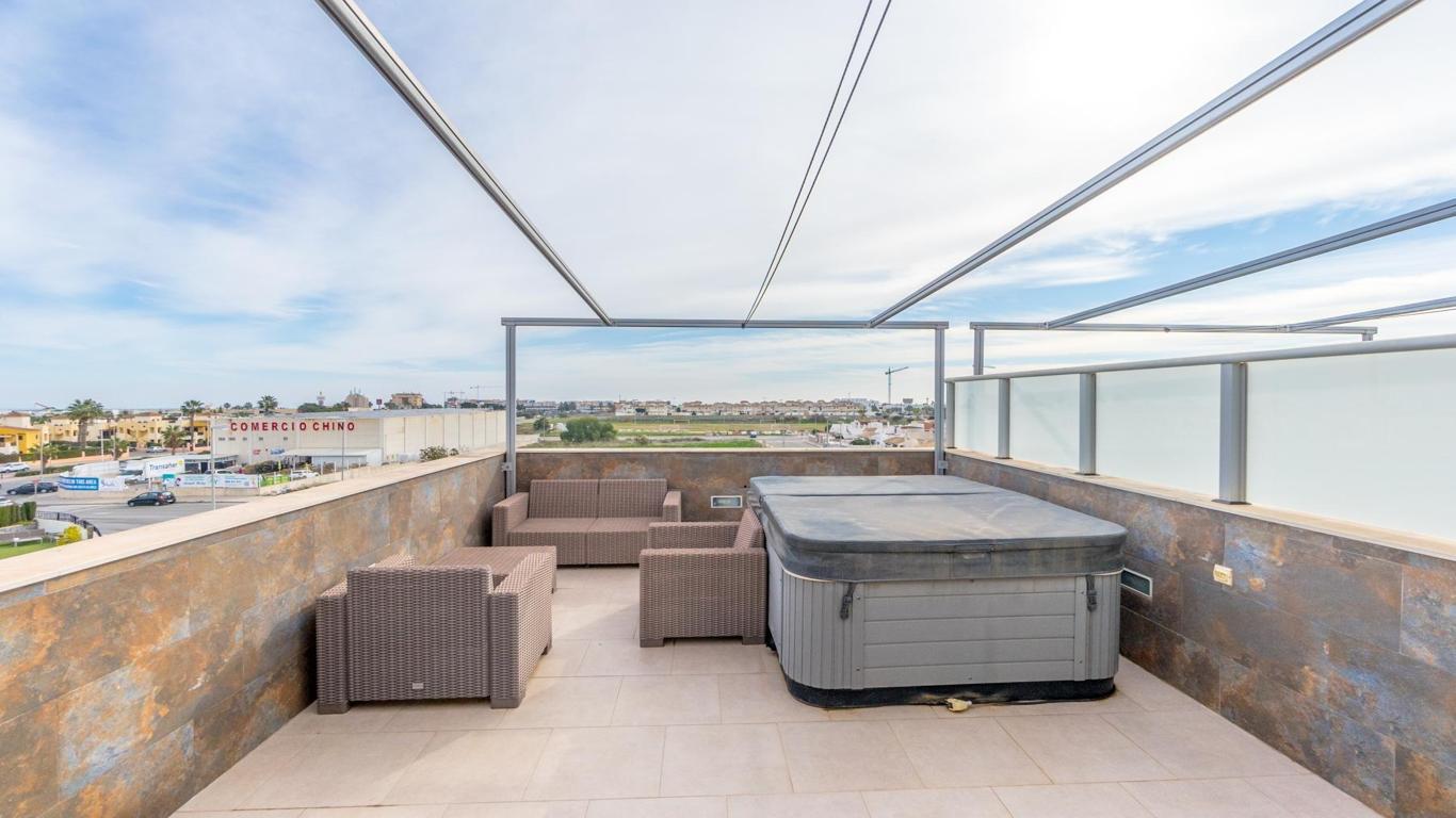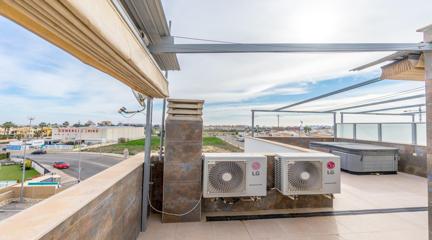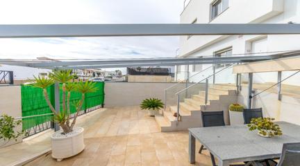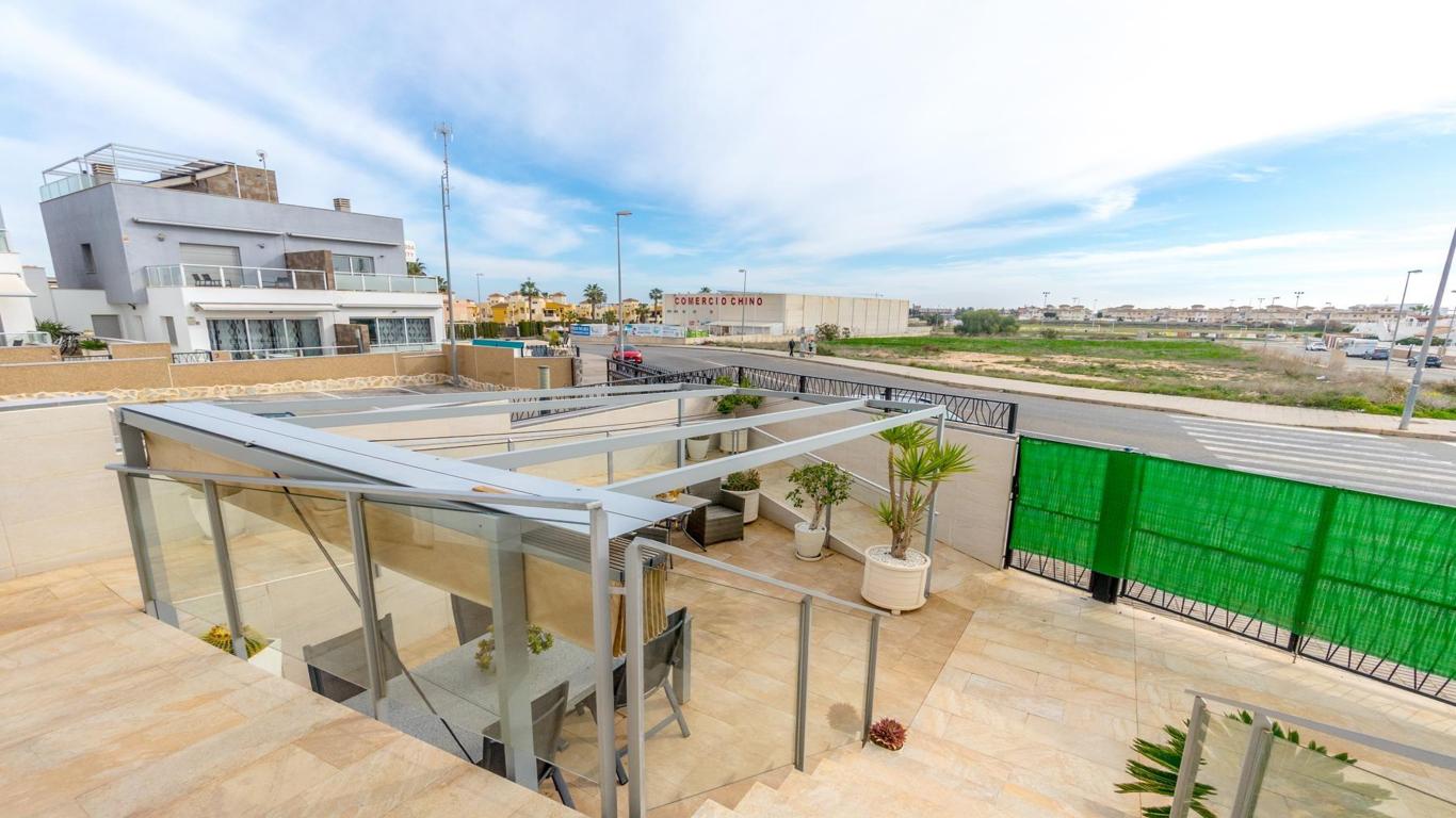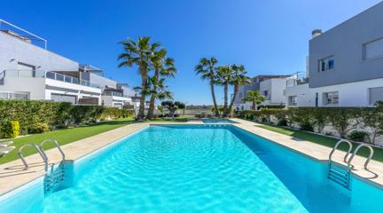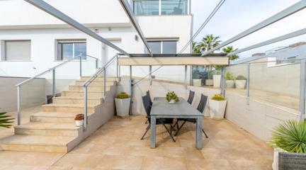 Unique opportunity to buy your home in Punta Prima, Orihuela Costa This modern style,part of quad built in 2016, is the perfect place to live comfortably all year round or enjoy unforgettable holidays. With 2 floors plus roof terrace, this property has it all: space, light and comfort.The house is located in a residential complex with a communal swimming pool, exclusively for its residents, ideal for enjoying the sun and relaxing in a quiet and safe environment. Located in the vibrant and strategic area of Punta Prima, surrounded by all the essential services at your fingertips such as: shopping centres, international restaurants, schools, pharmacies, hospital and, of course, close to the beaches of Torrevieja and Orihuela Costa.In the paved garden, you will find a ramp that facilitates access for people with reduced mobility, or easy access for bicycles. It also has a pergola that gives you shade on hot summer days, so you can enjoy outdoor meals with family or friends, and enough space to park a small car. Upon entering, you are greeted by a bright living room with a fully equipped open-plan kitchen, ideal for day-to-day living. On this floor, you also have a bedroom and a complete bathroom.Going up to the first floor, two spacious and light-filled bedrooms awaits you. One of them includes an enclosed terrace, a perfect place to relax at any time of the year. There is also a full bathroom for the family. From here, we access the roof terrace, a unique space with unobstructed views and sea views, perfect for relaxing, sunbathing or enjoying the jacuzzi all year round.Thanks to its south-east orientation, the house receives plenty of natural light and is warm even in winter. It includes extras such as underfloor heating in the bathrooms, ducted air conditioning throughout the house and electric blinds. Sold furnished and equipped with electrical appliances. Don't miss this opportunity Call now and make an appointment. Come and see your future home and let yourself be conquered.