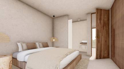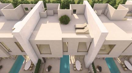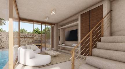 Homes designed in a stylish Ibiza style. The villas have a warm and inviting appearance with earth tones and plenty of natural light. The private solarium offers beautiful views of the surroundings and additional relaxation space. A 12.5 meter swimming pool provides a focal point for recreation. Outside, a landscaped garden with an outdoor shower offers extra comfort.