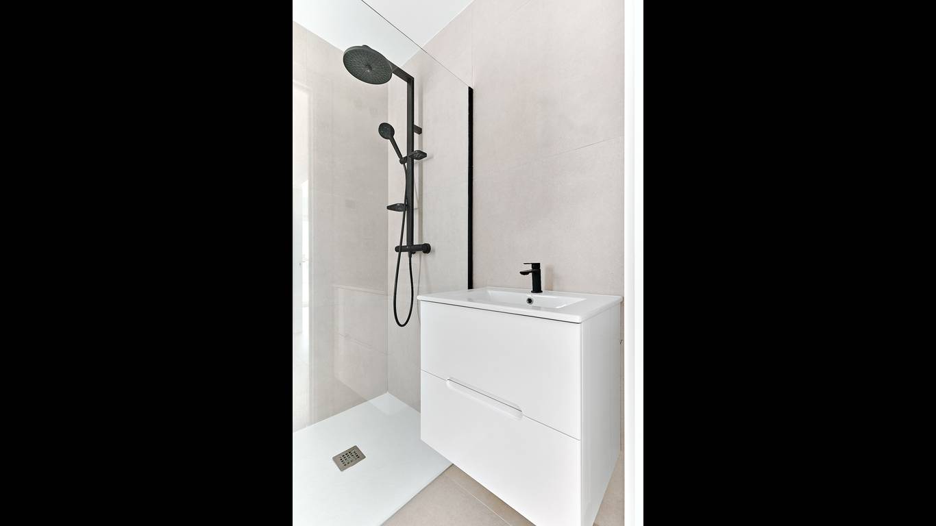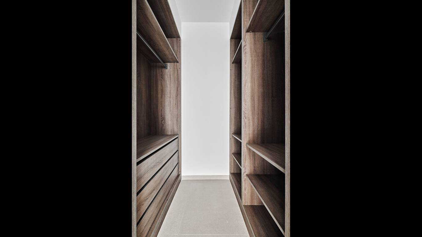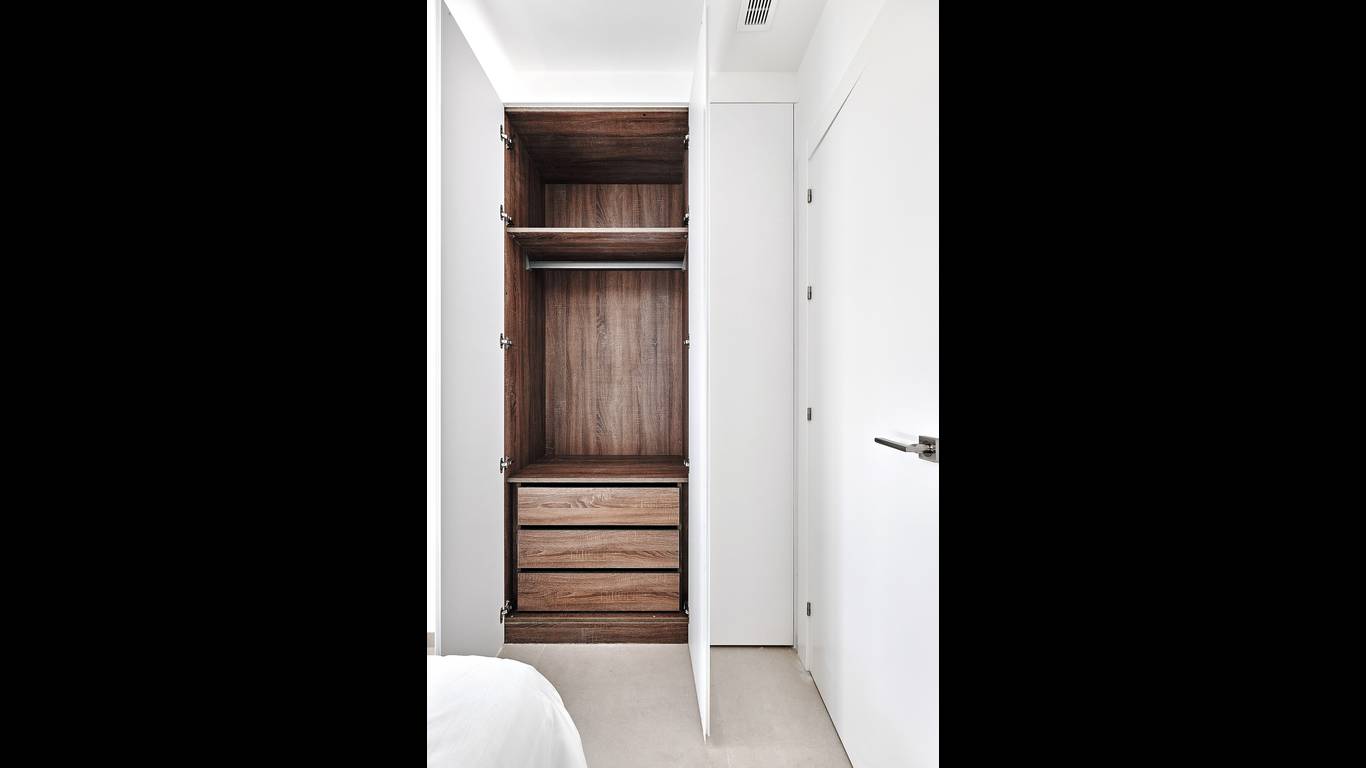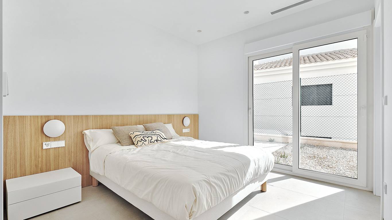 On entering the villa you will find a fitted wardrobe for hanging coats. At the front you will find an open kitchen, dining area and living room. The large windows provide a lot of natural light in the house. Behind the kitchen you will find two spacious double bedrooms, a bathroom and a practical laundry room under the stairs. For the 3 bedroom villas there is a further master bedroom with en-suite bathroom downstairs.