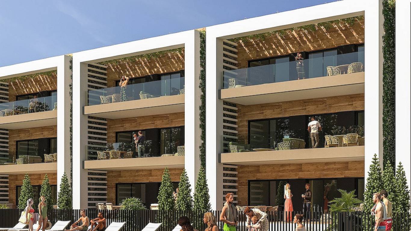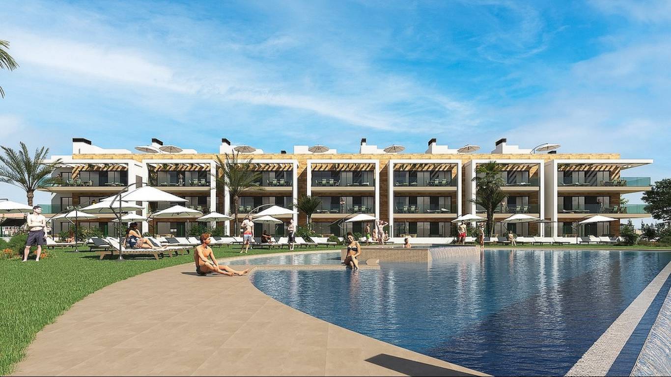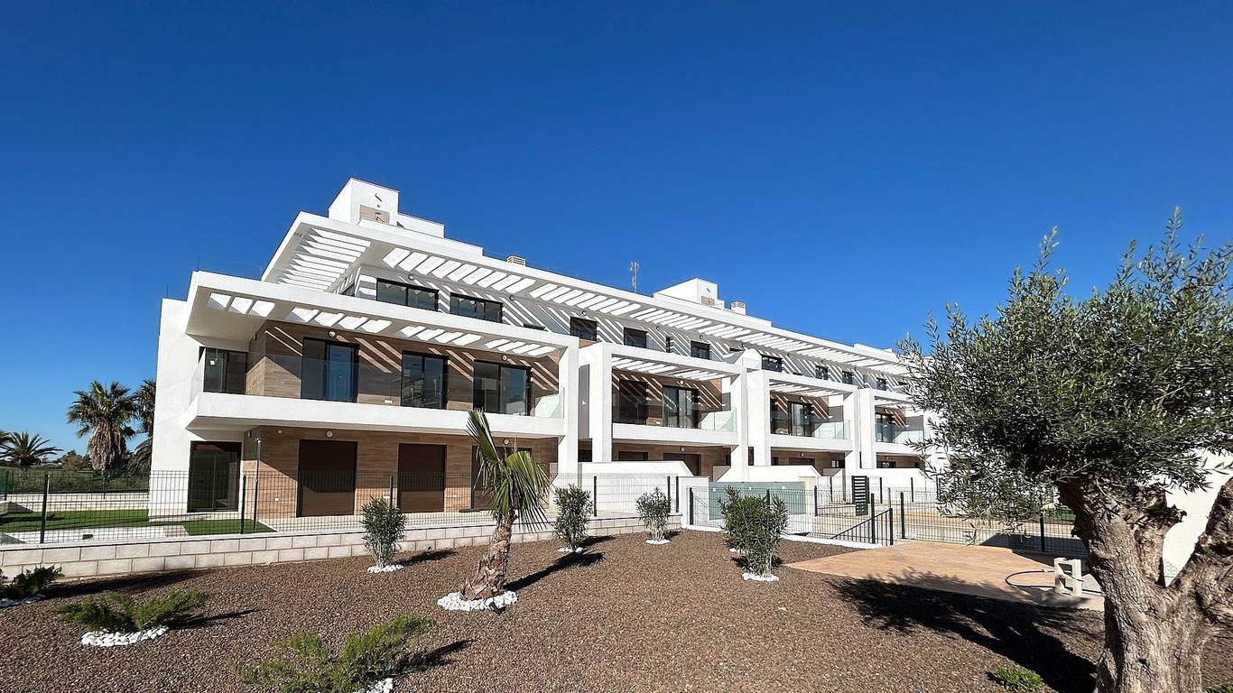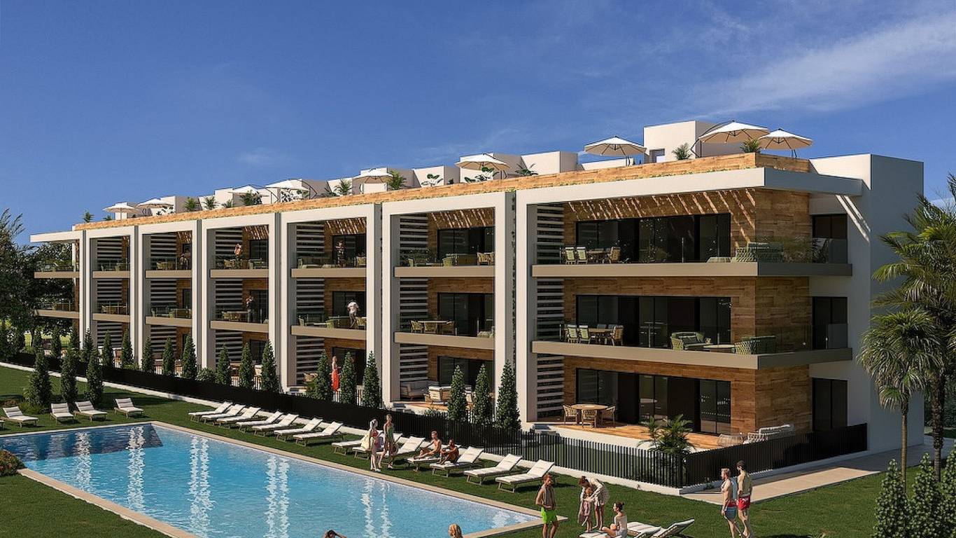 Enjoy the communal areas with a large swimming pool, sports fields, green areas and playgrounds. All apartments have an underground parking garage and offer beautiful views of the golf course and the sea.