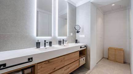 3 amplios dormitorios dobles, incluyendo una majestuosa suite principal con vestidor, baño privado con ducha y bañera, y un acogedor espacio de oficina.