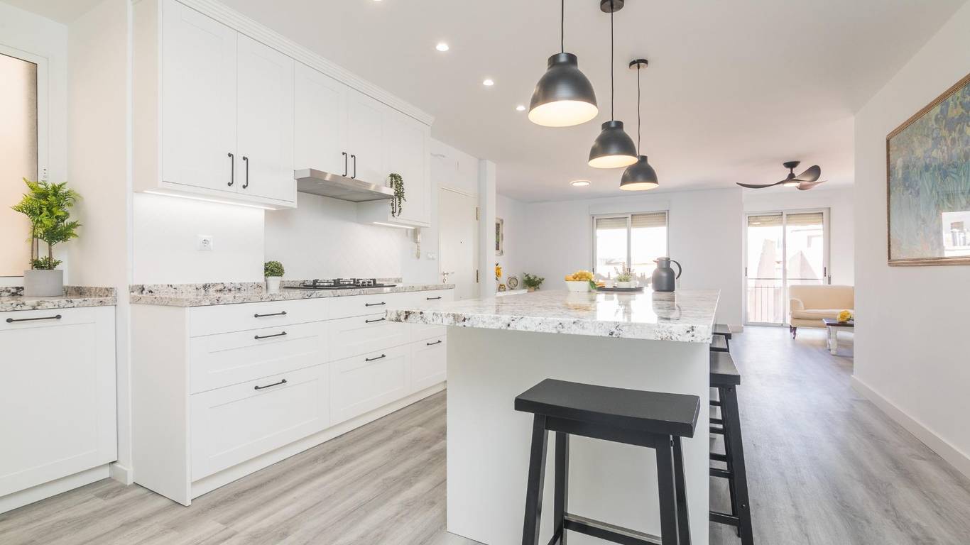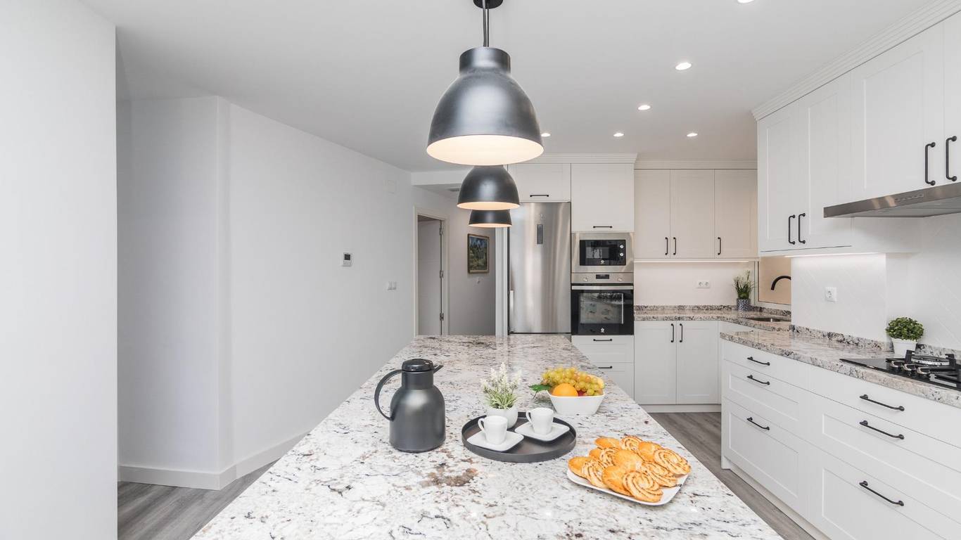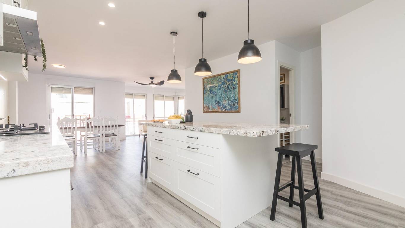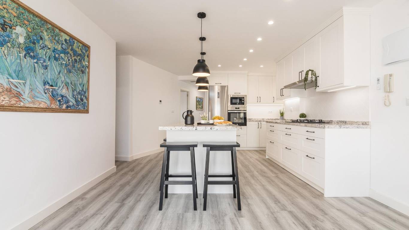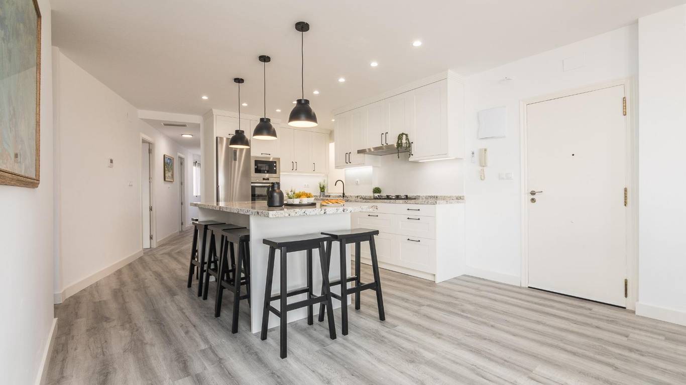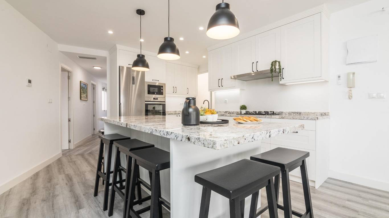 The main living area consists of a large living-dining room with floor-to-ceiling windows, providing immense light and privileged views of the dome of the Basilica of Santa María. The kitchen is designed with high-quality materials, including a large granite island perfect for gatherings with seating for seven stools. The Balay appliances are state-of-the-art, brand new and unused.