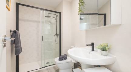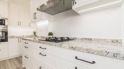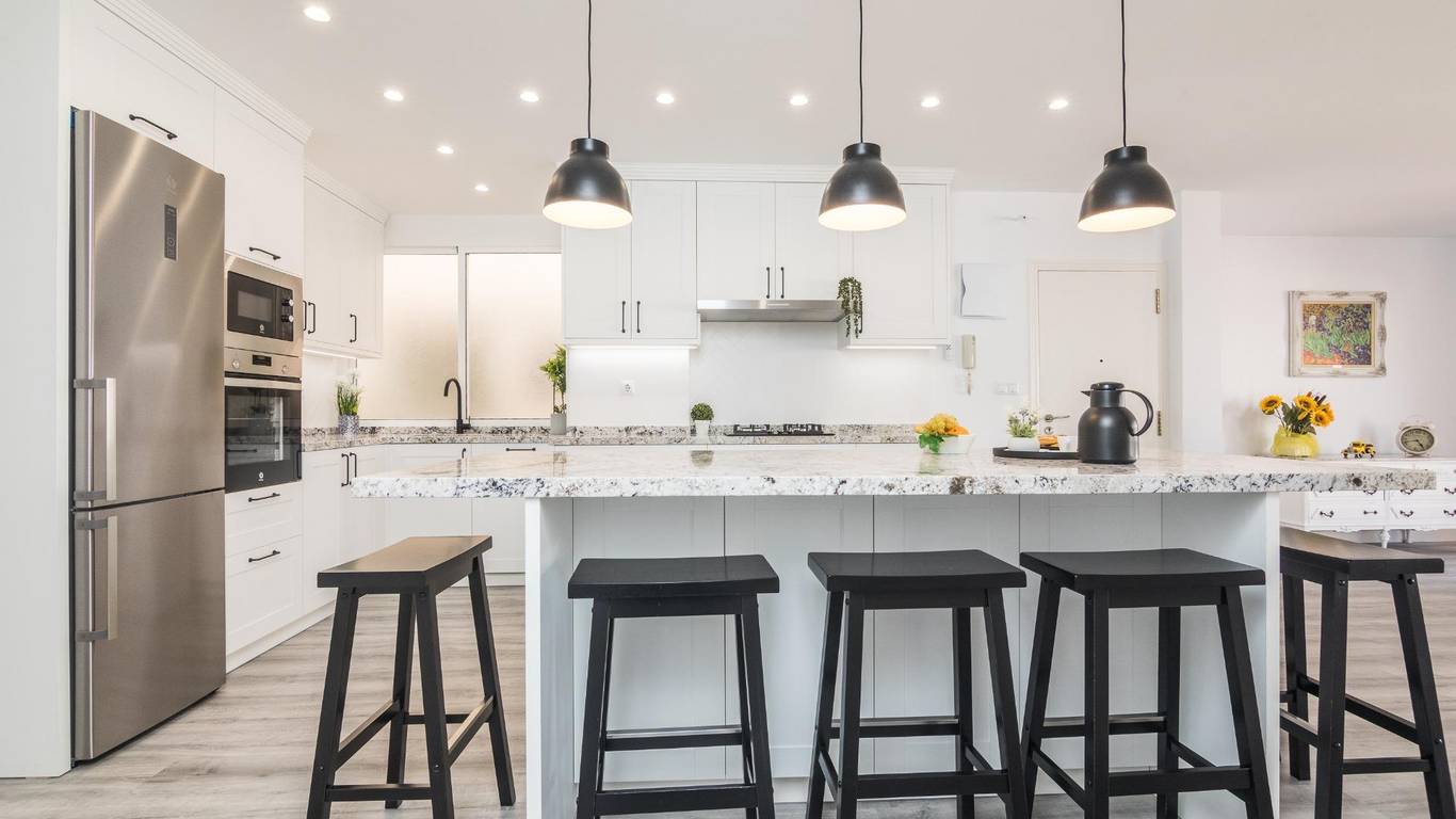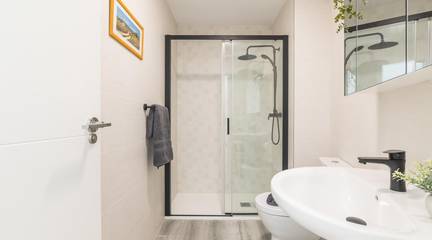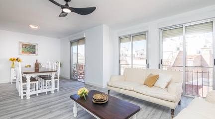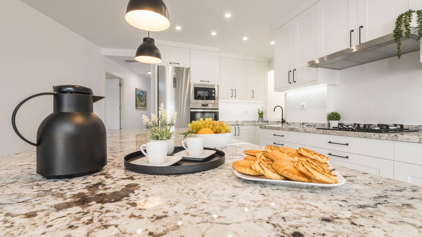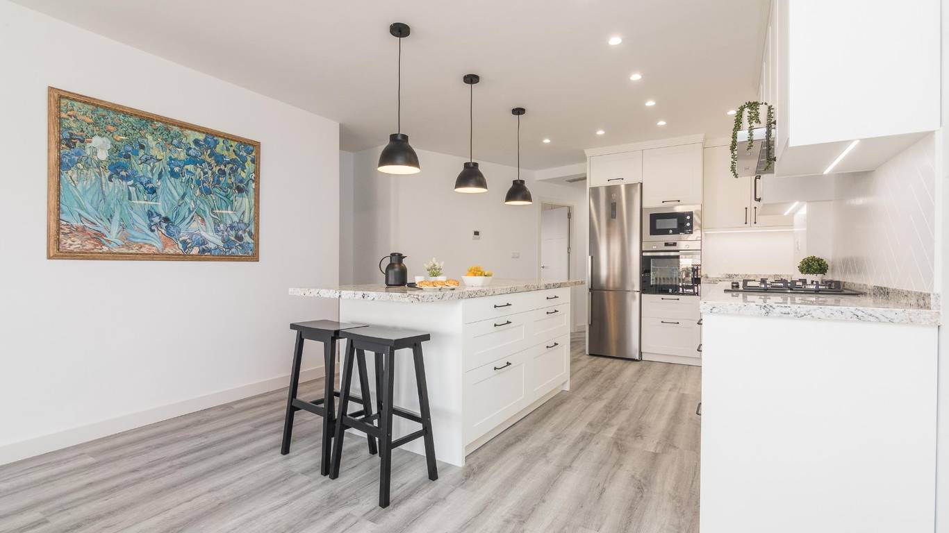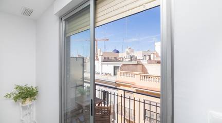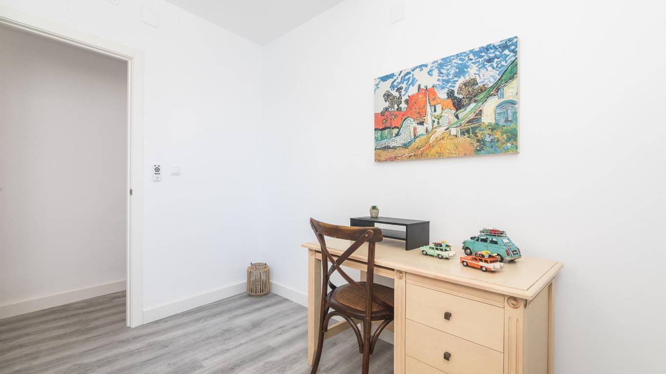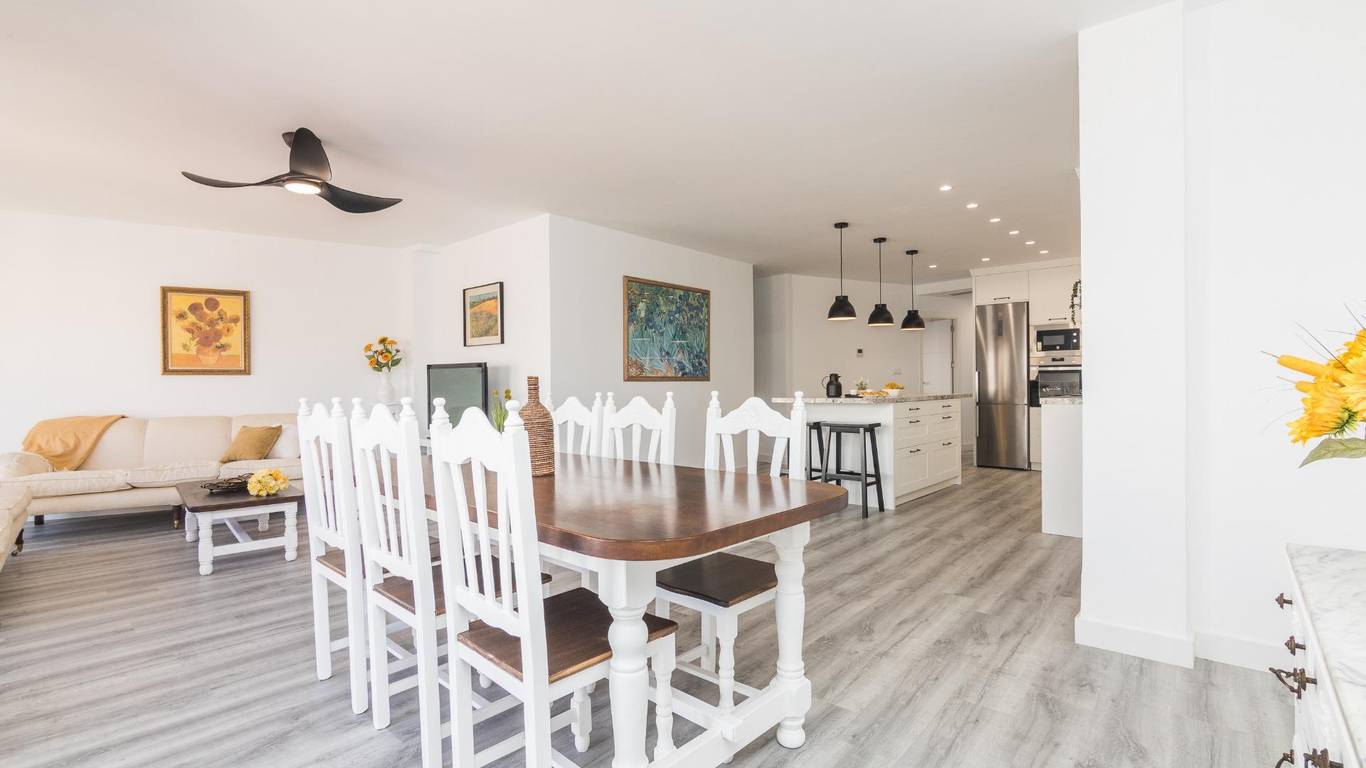 The main living area consists of a large living-dining room with floor-to-ceiling windows, providing immense light and privileged views of the dome of the Basilica of Santa María. The kitchen is designed with high-quality materials, including a large granite island perfect for gatherings with seating for seven stools. The Balay appliances are state-of-the-art, brand new and unused.