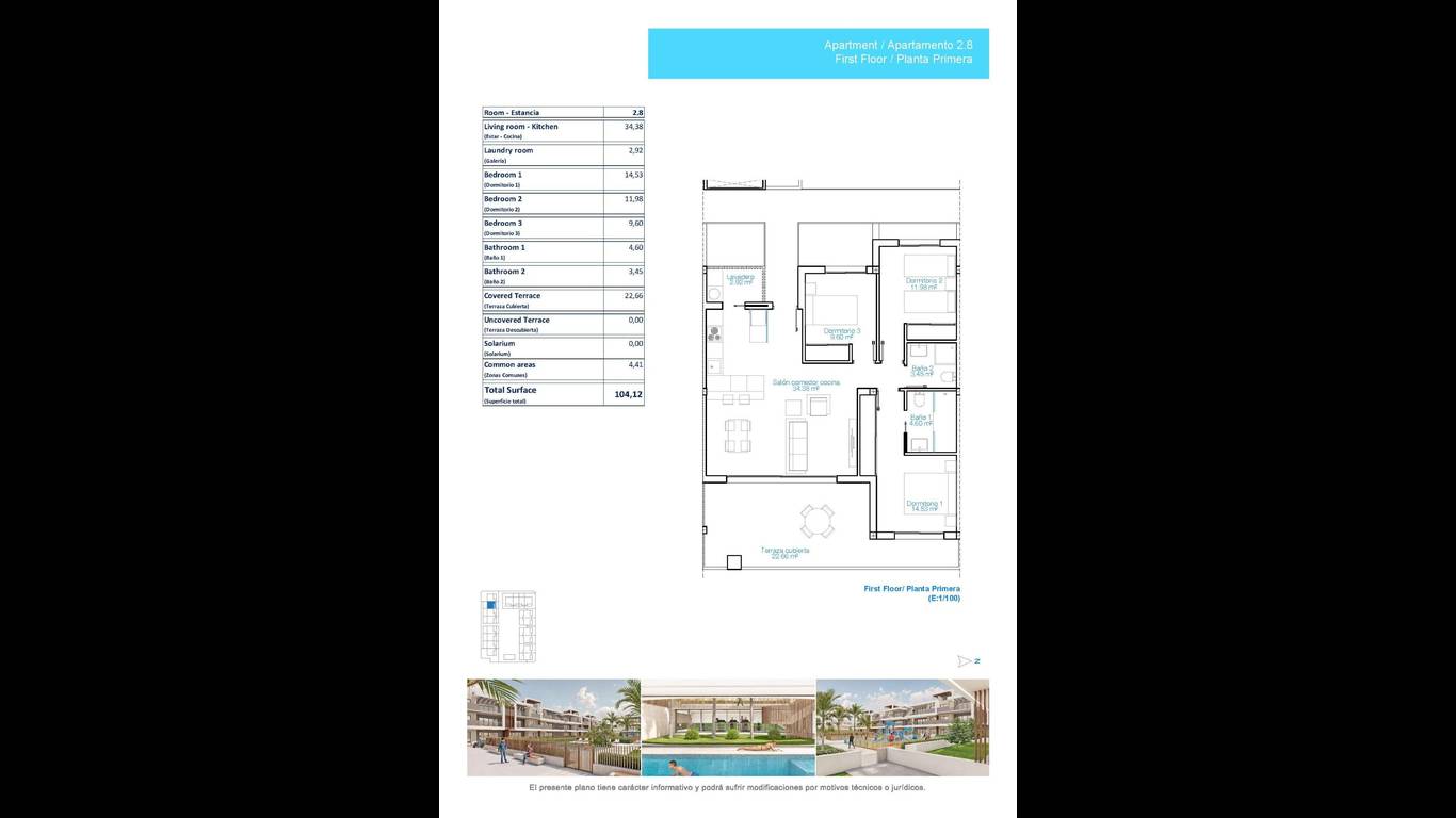 Luxury Tourist Apartments Just 150m from Las Higuericas Beach Torre de la HoradadaExclusive New Development with Rental License IncludedWelcome to a new residential complex in Torre de la Horadada, just 150 meters from the golden sands of Las Higuericas Beach. This modern project offers 48 fully furnished tourist apartments, all delivered with a short-term rental license, making it an ideal investment for holiday rentals or personal enjoyment.Choose from 42 units with 3 bedrooms and 2 bathrooms or 6 units with 2 bedrooms and 2 bathrooms, all thoughtfully designed to maximize comfort, style, and functionality.Layouts Designed for Coastal LivingEach property is tailored to meet different lifestyle needs:Ground floor units feature spacious private gardens with views of the communal areas.First-floor apartments offer large terraces, some with partial sea views.Penthouses boast private solariums with sea views and outdoor kitchens, pergolas, jacuzzis, and artificial grass.All homes include a private underground parking space and storage room, with first-phase completion scheduled for summer 2026.Fully Equipped and Move-In ReadyThese homes come fully equipped for immediate occupancy, including:Complete Mediterranean-style furniture and décorFully fitted kitchens with appliancesIndependent utility roomsUnderfloor heating throughoutDucted air conditioning (hot/cold)Bed linens and household goodsWindows feature electric shutters and Climasun thermal-acoustic glass, while energy-efficient aerothermal systems provide hot water.Resort-Style Communal Areas for Year-Round EnjoymentThe development includes extensive communal amenities, such as:Outdoor swimming pool for adults and childrenChildrens playgroundLandscaped green areasWellness area in the basement with heated indoor pool, massage jets, sauna, and a fully equipped gymEvery detail has been designed to provide residents and guests with a relaxing and luxurious Mediterranean experience.Prime Location with Easy Access to Top AttractionsThis unbeatable location offers proximity to the best of the Costa Blanca and Costa Cálida:Las Higuericas Beach 150 mLo Romero Golf Course 10 kmDos Mares Shopping Center 11 kmPort of San Pedro del Pinatar 8 kmMurcia Airport 30 kmAlicante Airport 65 kmSecure Your Coastal Investment TodayIf you are looking for a holiday home or a rental investment, this is your opportunity to own a premium property near the beach in one of the most sought-after areas. Contact us now to learn more or schedule your visit to Torre de la Horadada