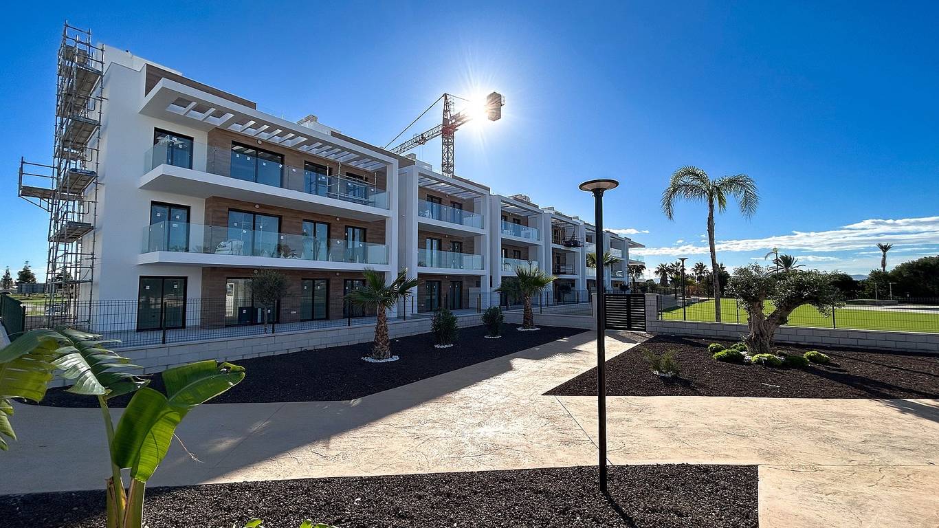 Enjoy the communal areas with a large swimming pool, sports fields, green areas and playgrounds. All apartments have an underground parking garage and offer beautiful views of the golf course and the sea.
