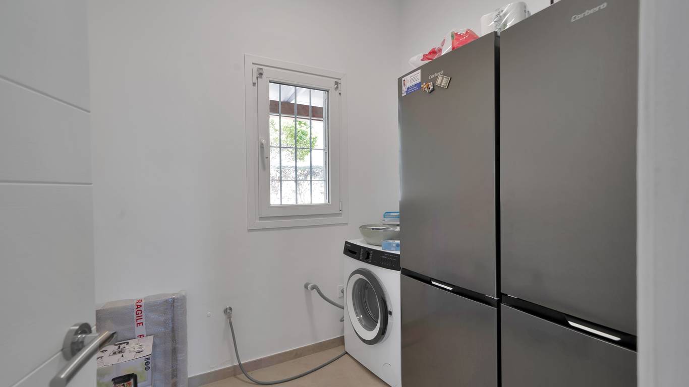 The kitchen open-plan, modern, and equipped with high-end appliances, including an island sleek design touches. An adjoining utility room houses refrigerators, laundry machines, and ample pantry space.