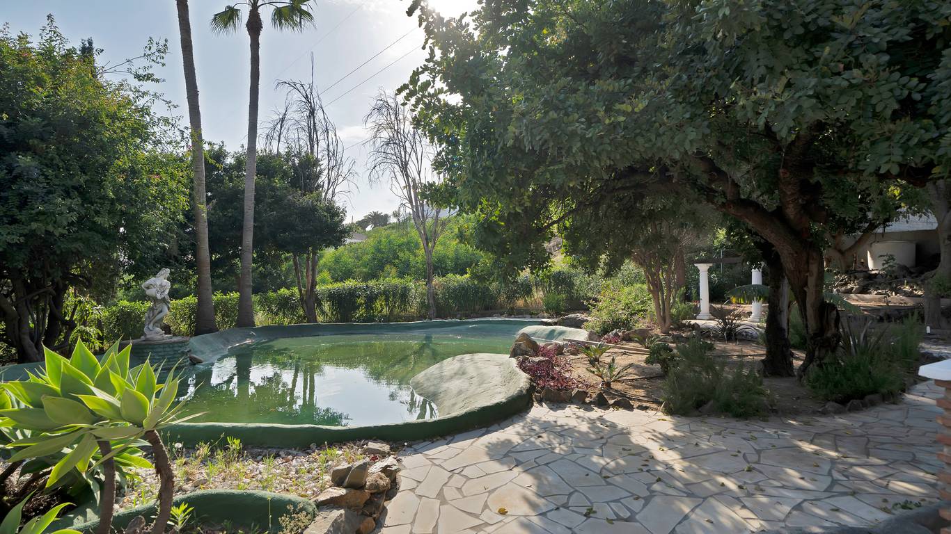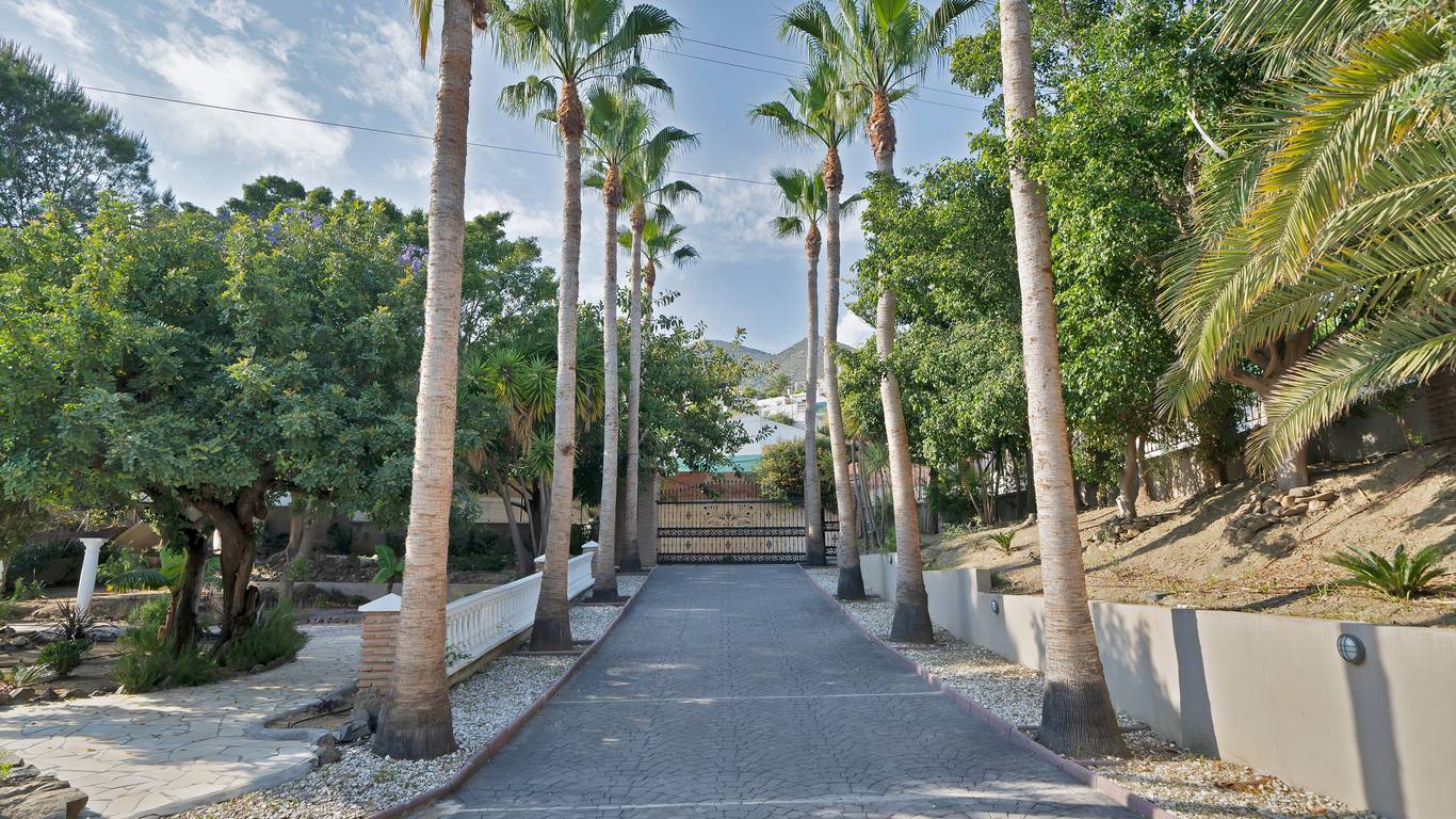 As you follow the stone path through the mature garden, filled with palm trees and Mediterranean flora, you arrive at the main entrance. To your right, a generous outdoor parking area awaits, accommodating up to 4 vehicles, in addition to a covered garage for 3 more.