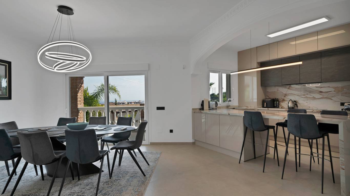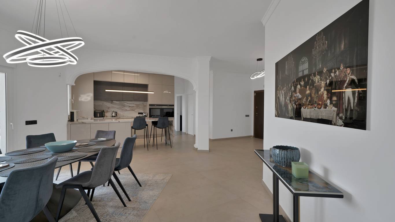 Next to the kitchen, a generously sized dining room with large windows leads to the terrace.