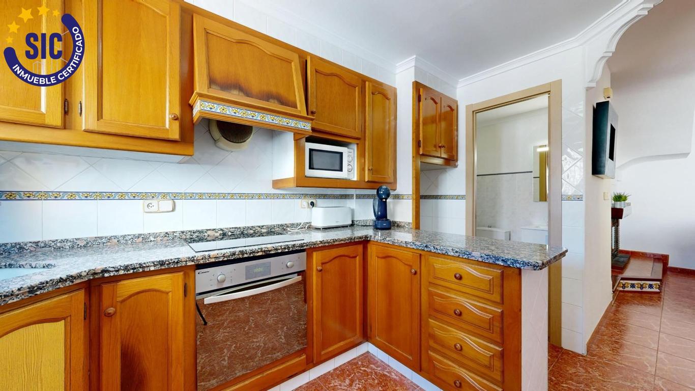La cocina está completamente equipada, con vitrocerámica, horno, microondas y nevera, lista para su uso.