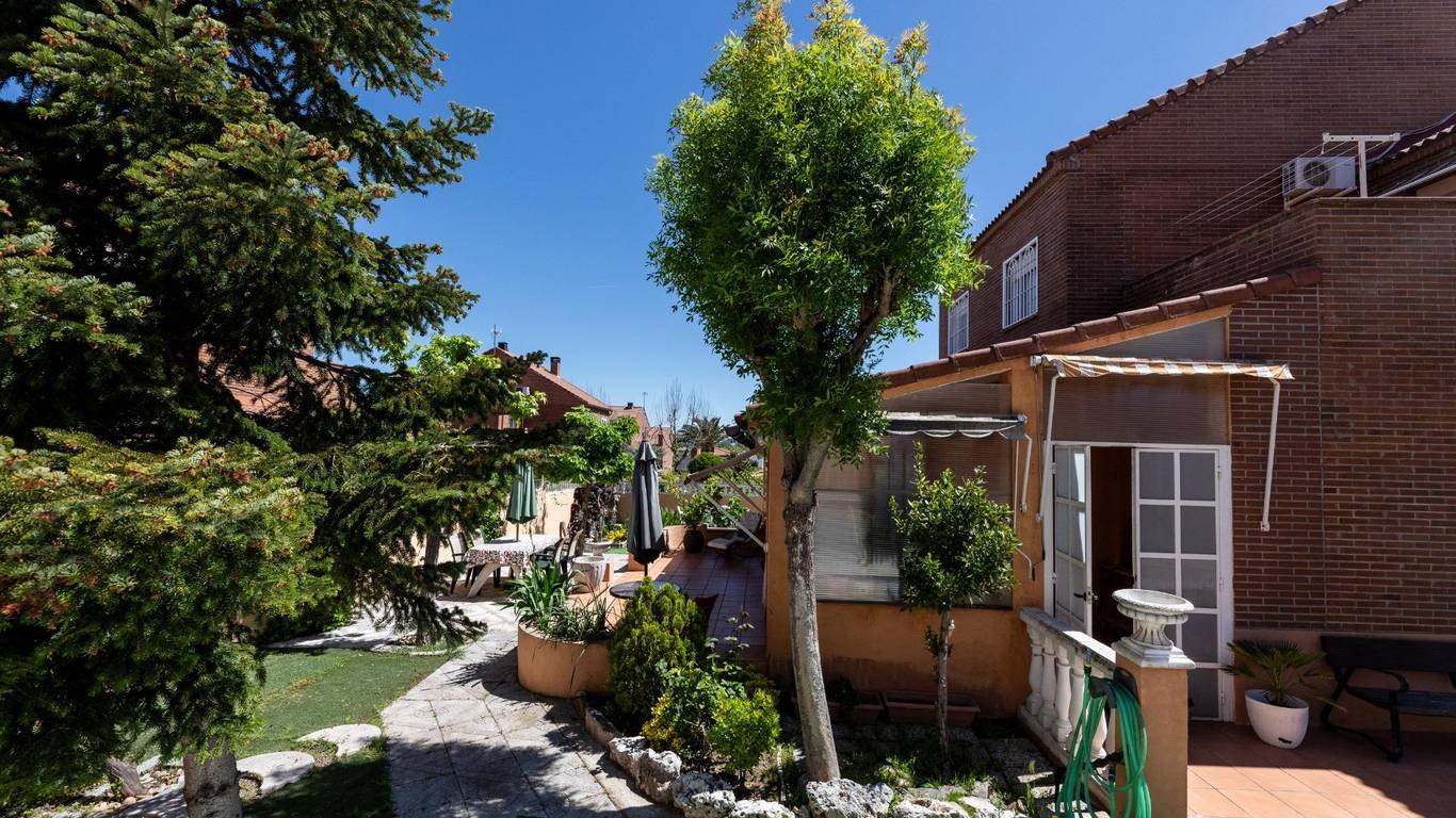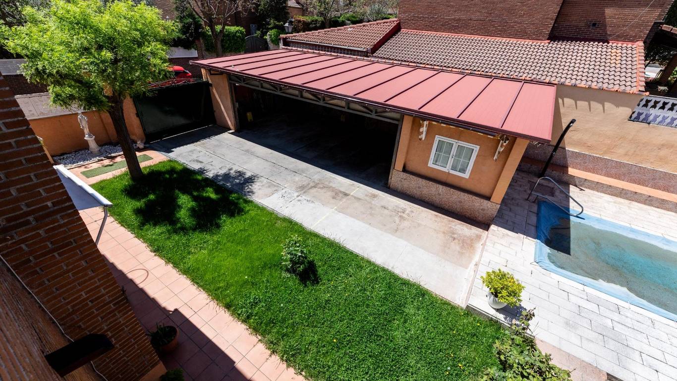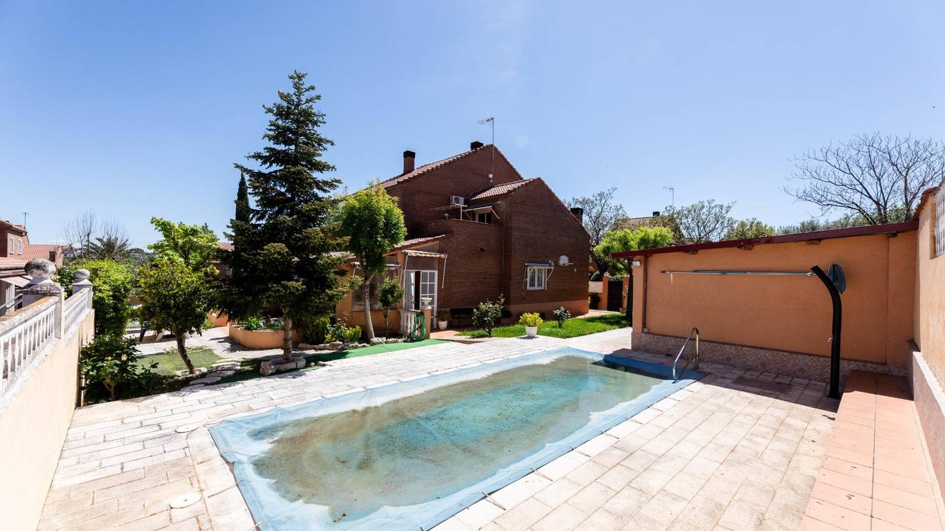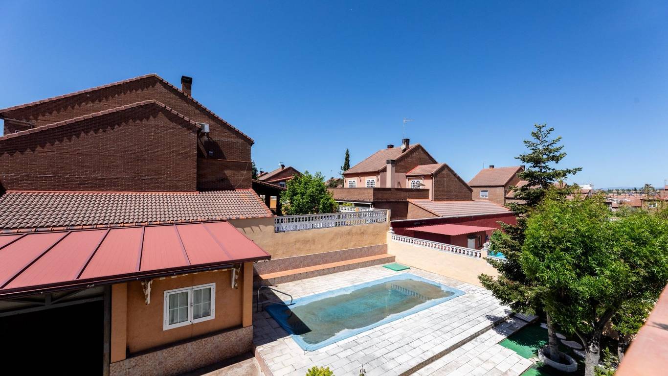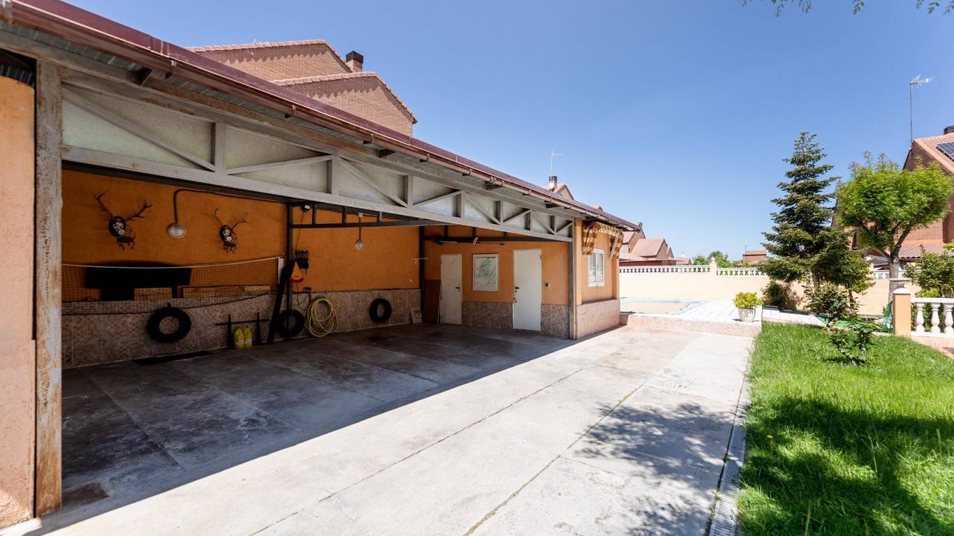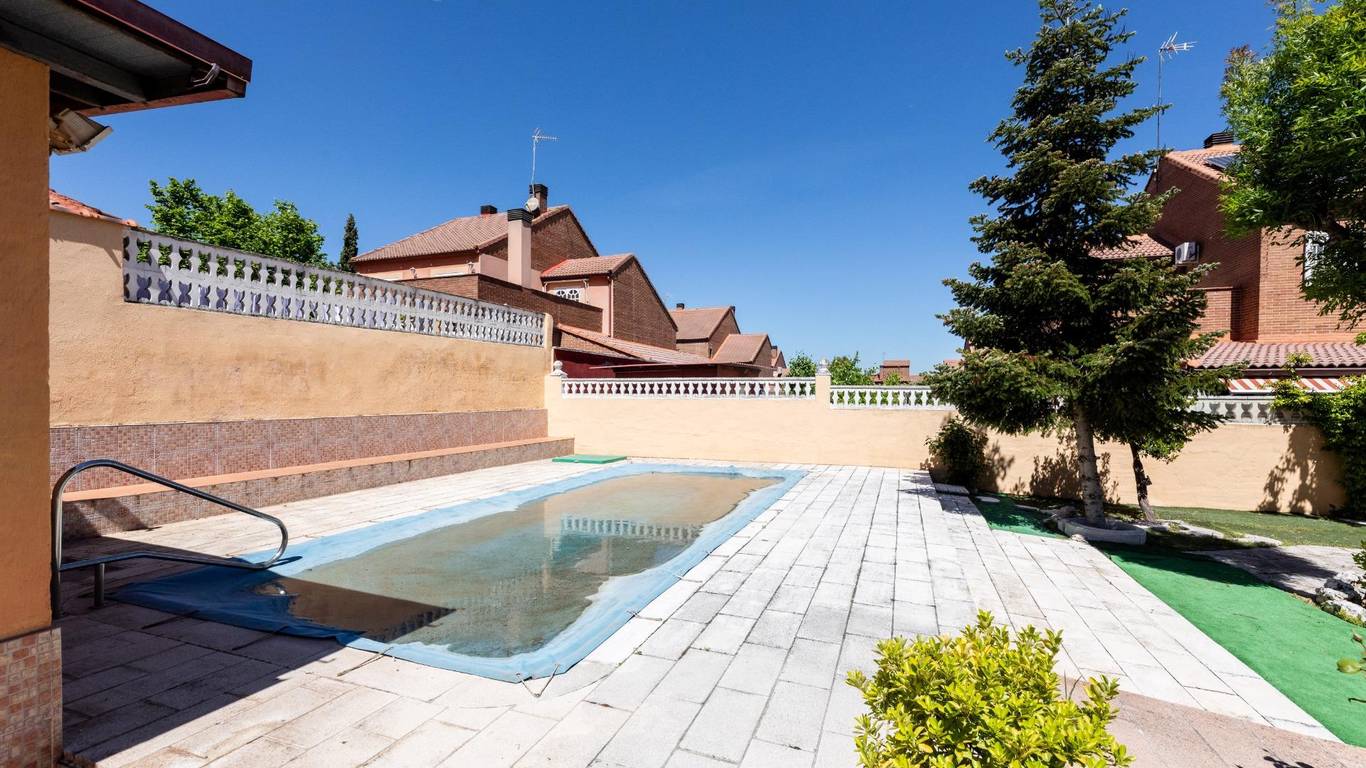 SPECTACULAR DETACHED VILLA IN THE CENTER OF ARROYOMOLINOS, WITH A PLOT OF 688m2 AND 325m2 BUILT IN LIVING ROOM AND PRIVATE POOL, WITH 6 BEDROOMS, 3 BATHROOMS, KITCHEN WITH OFFICE, LARGE PORCH, LIVING ROOM WITH FIREPLACE, GARAGE FOR 3 CARS The house is distributed over three floors built in one of the largest in Arroyo of 688 m2 with an established garden and swimming pool. On the main floor we find a hall that gives us access to a toilet with shower, down to the lower floor (old garage, current gym), bedroom-office, and the kitchen area with office and a very large living room with two heights with fireplace and air conditioning, and with direct access to the back porch, A spectacular space that continues the main floor and, due to its spaciousness and its wonderful barbecue with oven, is one of the most used and enjoyable rooms in the house. This space has awnings. The kitchen is very spacious, fully equipped, and has a large office space. Accessing the stairs, we find the second floor, which has 5 bedrooms with air conditioning and built-in wardrobes, 2 of them with a terrace. The master bedroom has an en-suite bathroom, and another bathroom serves the other 4 bedrooms. All rooms are bright and very spacious. We highlight the house's bars on all windows, built-in wardrobes, air conditioning in several rooms, awnings, etc. Garden and pool area: The plot is very large and flat, with trees and shrubs of many species (firs, strawberry trees, chestnuts) and many years old, making it one of the plots with the best-established garden in Arroyo. The pool is located on a paved area with a non-slip floor and an outdoor solar shower. The pool, made of concrete and tiled tiles, has interior stairs and access handrails. Also on the plot is the garage, which is accessed from the outside through a mechanized door and has space for three cars inside and two-thirds at the entrance. Attached is a storage room ideal for garden and pool tools. This property is unique for its spacious plot, garden, pool, and comfortable layout. So don't miss this opportunity to live in the home of your dreams in Arroyomolinos.