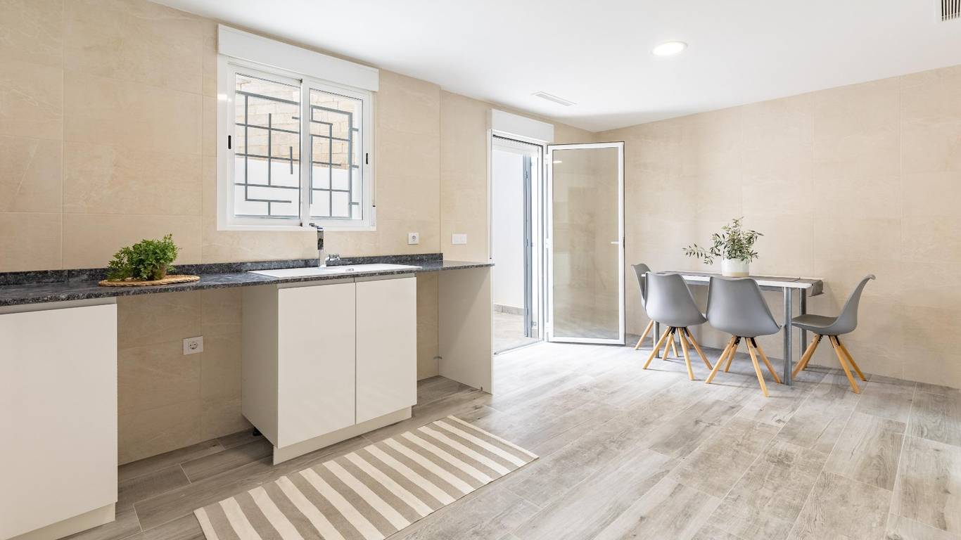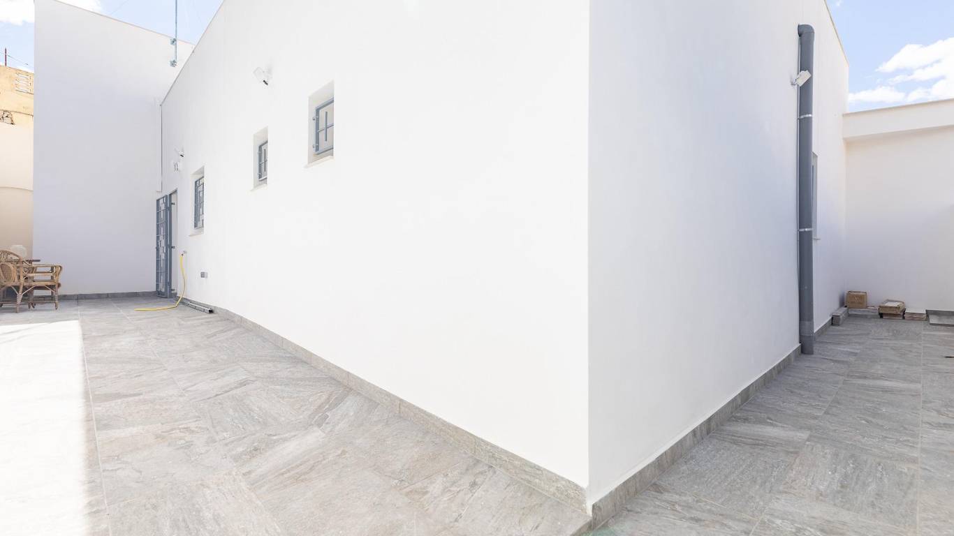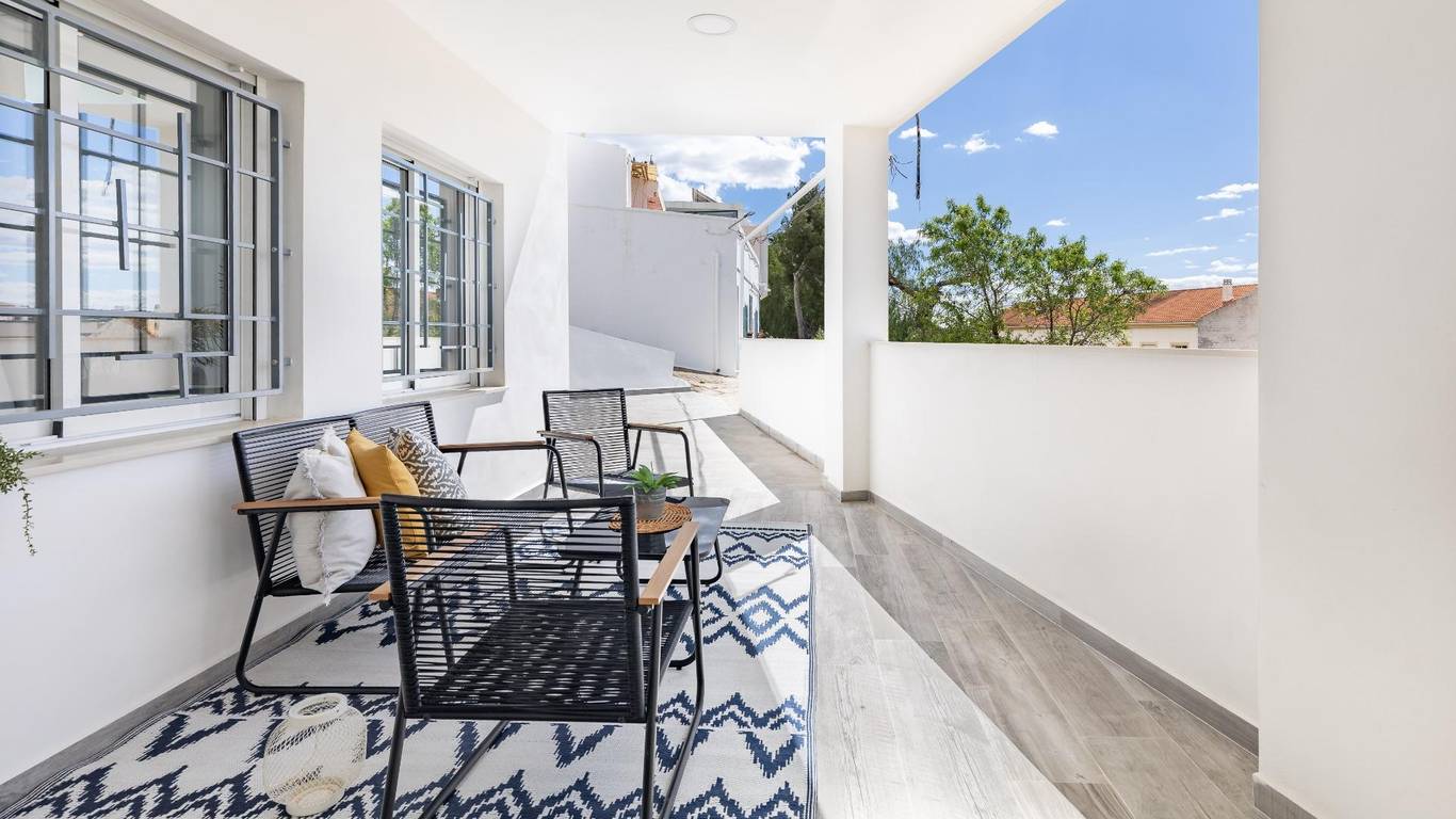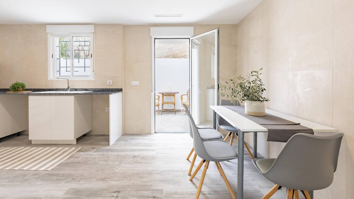 From the living room we access the second full bathroom, designed to offer comfort and functionality. The kitchen, located next to the dining area, is spacious and bright, with direct access to the backyard. From the living room, a small hallway leads to another large double bedroom, with built-in closet, and to the stairs leading up to the attic and the terrace.