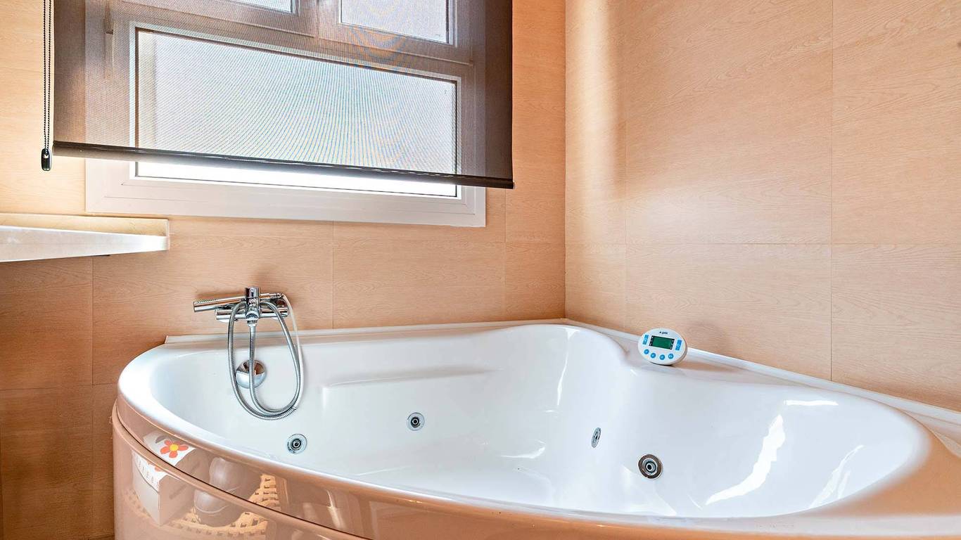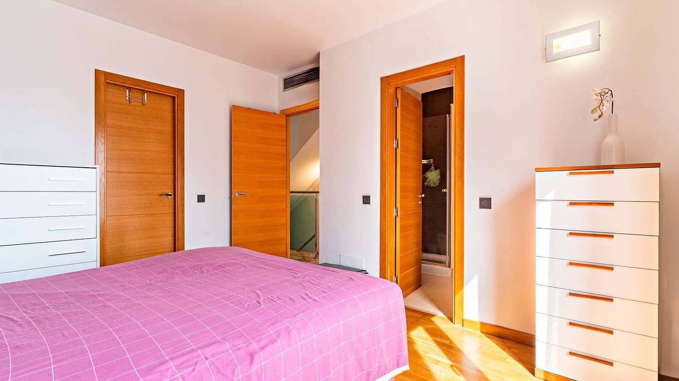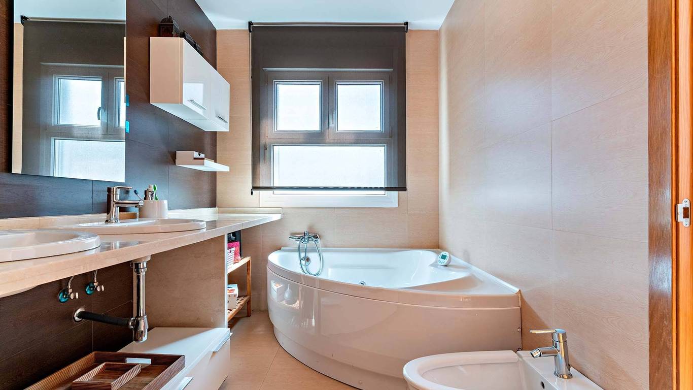 Primera planta: El dormitorio principal cuenta con un vestidor, un baño en suite con bañera de hidromasaje, dos lavabos y plato de ducha, y acceso a una terraza privada. Completan esta planta dos dormitorios más, ambos con armarios empotrados, y un baño compartido completo con bañera.