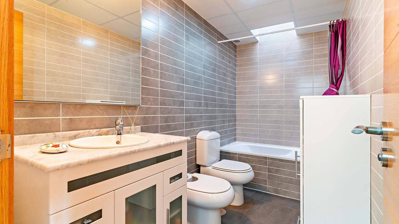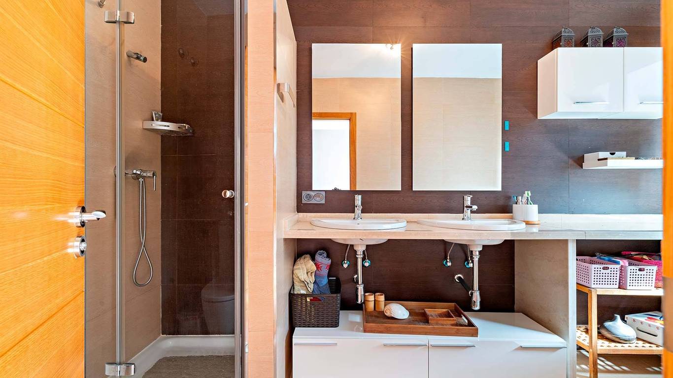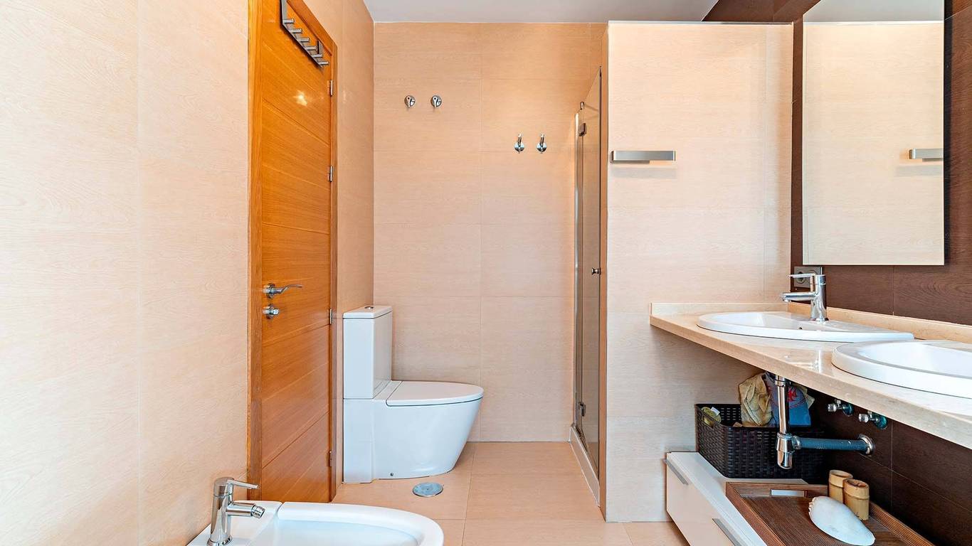 Primera planta: El dormitorio principal cuenta con un vestidor, un baño en suite con bañera de hidromasaje, dos lavabos y plato de ducha, y acceso a una terraza privada. Completan esta planta dos dormitorios más, ambos con armarios empotrados, y un baño compartido completo con bañera.