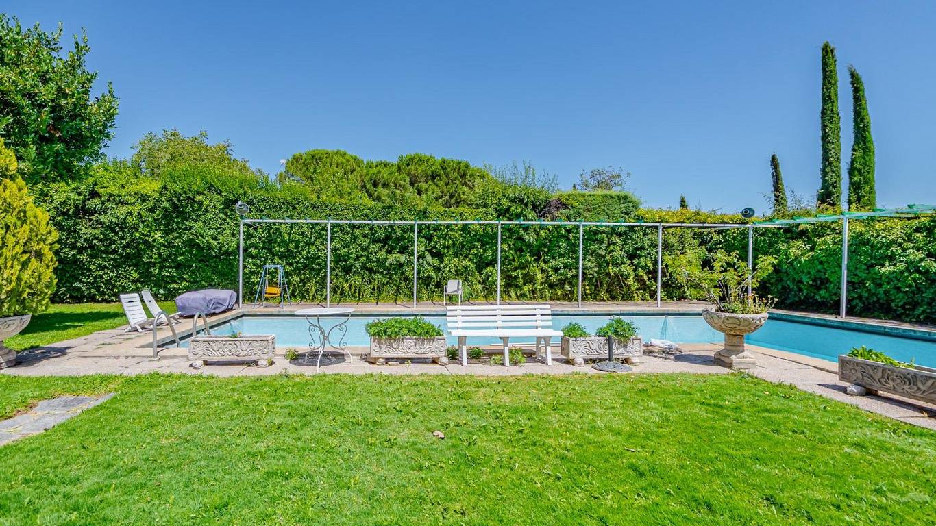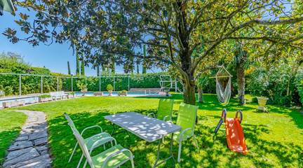 Esta propiedad ofrece un entorno único para disfrutar al aire libre. Su jardín, cuidadosamente mantenido y salpicado de árboles centenarios que brindan una sombra acogedora, invita a relajarse, celebrar reuniones en familia o simplemente disfrutar de una tarde de lectura en la hamaca. La gran protagonista del exterior es su espectacular piscina en forma de L, con una profundidad superior a la habitual, ideal para los días de verano. Dispone de pozo propio.