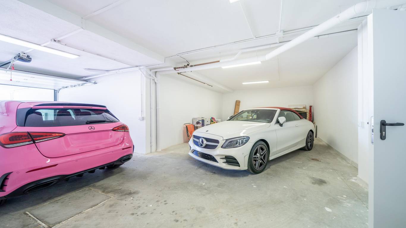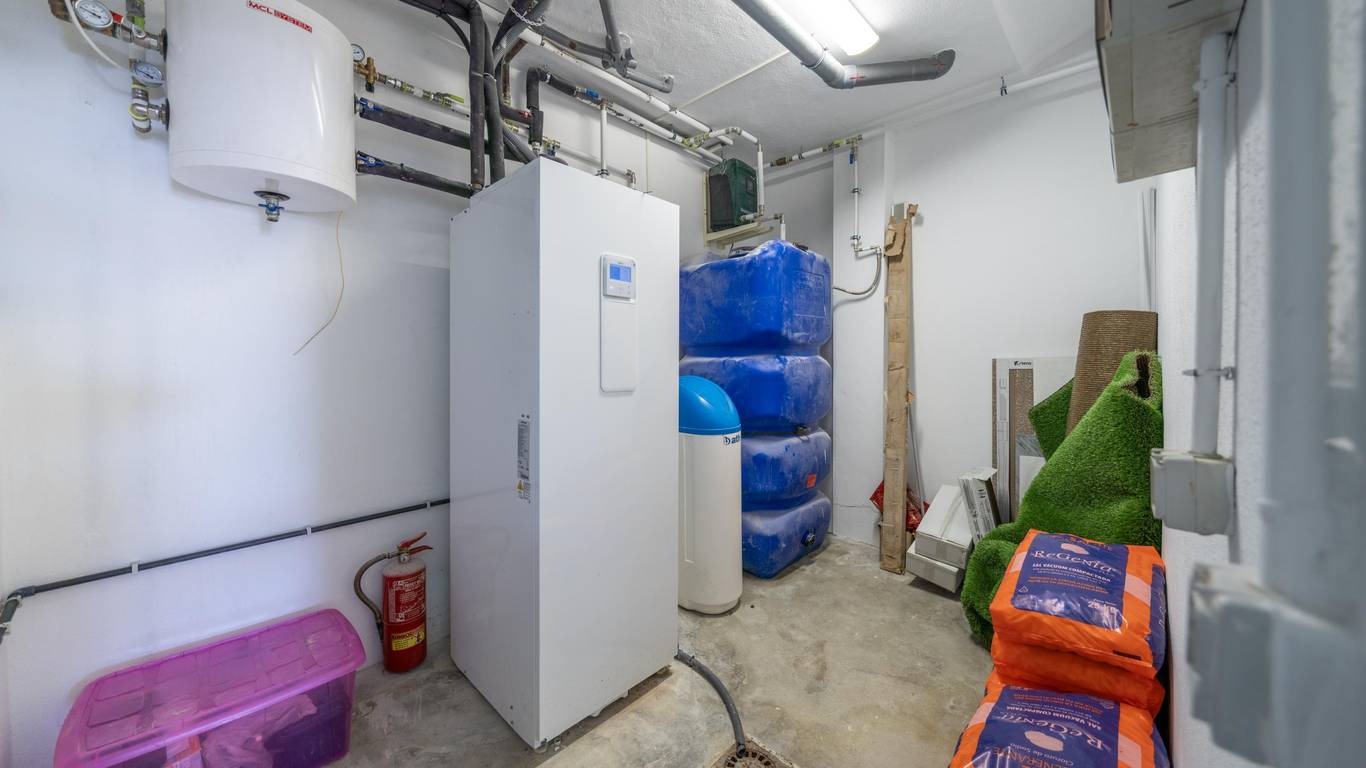 The basement level (169 m2 built) offers a private garage for two vehicles, a versatile multipurpose room ideal as a playroom, cinema or lounge for the kids, and a technical storage area housing the aerothermal system, water softener, and main water tank.