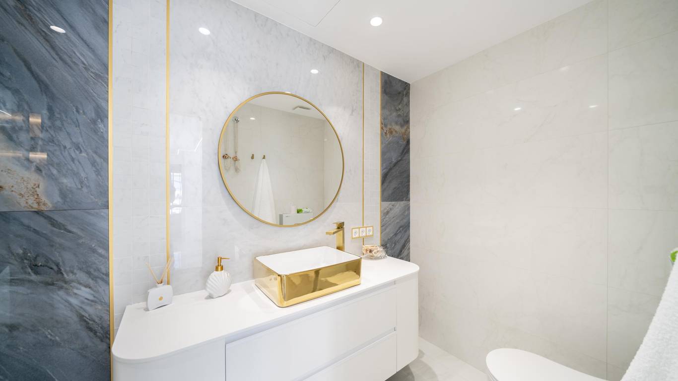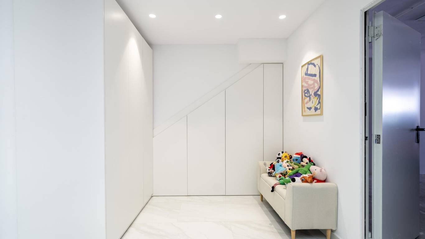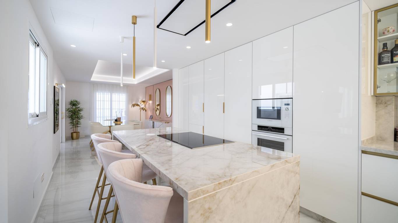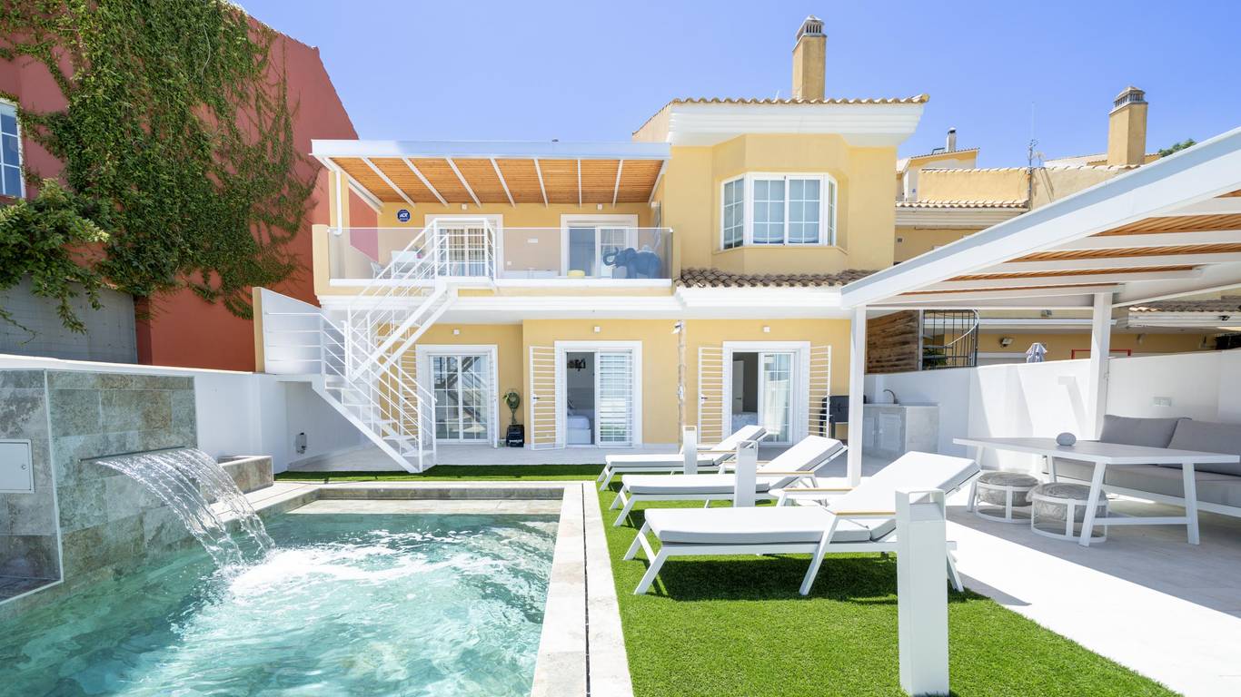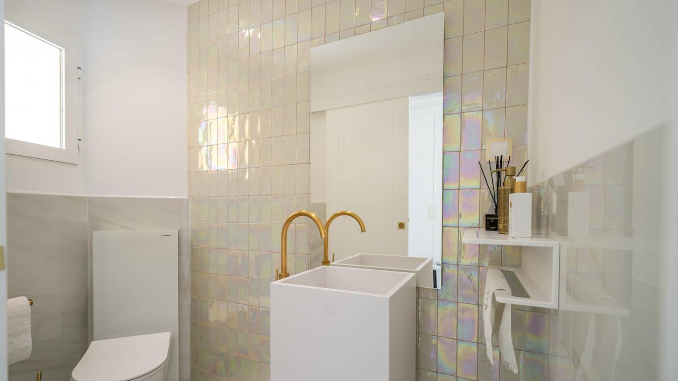 On the main floor (98m2 built), access is through a charming private patio that leads into a hallway. To the right you`ll find, the fully equipped open-plan kitchen with a central island, a custom-designed dining area, and a spacious, bright living room with direct access to a sunny terrace ideal for outdoor breakfasts or evening meals. To the left, there is a modern staircase with stylish, futuristic lighting that leads to the lower floors, as well as a guest toilet.