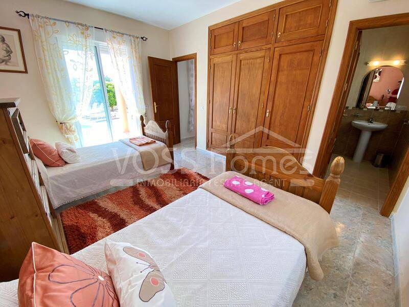 Primero se encuentra un dormitorio doble de invitados, seguido del baño familiar y el segundo dormitorio de invitados. Al final del pasillo se encuentra el dormitorio principal con armarios empotrados y baño en suite con ducha a ras de suelo. Este dormitorio tiene puertas dobles acristaladas que dan acceso a la terraza delantera y a la piscina. Los tres dormitorios disponen de aire acondicionado frío y calor.