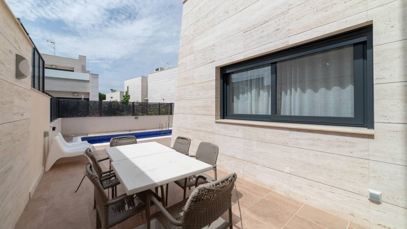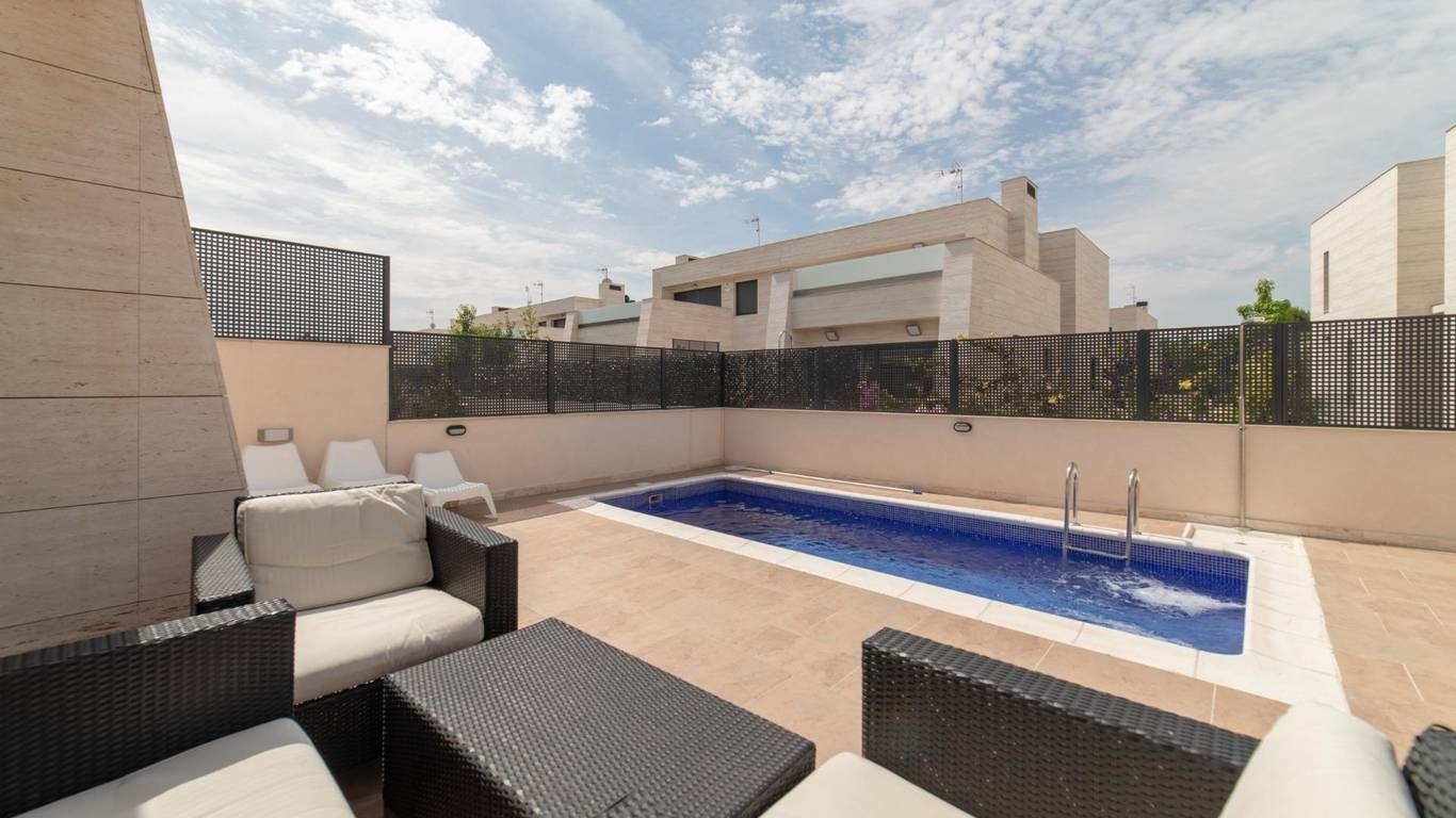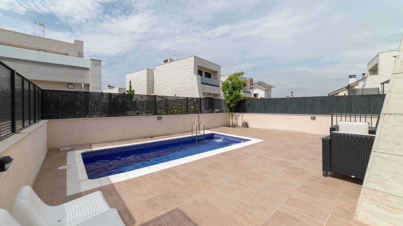 Exclusiva vivienda unifamiliar pareada con piscina en Villanueva de la Cañada Ubicada en Av. Argentina 42, en una de las zonas más tranquilas y residenciales de Villanueva de la Cañada (Madrid), esta magnífica propiedad combina diseño, amplitud y altas calidades en una parcela de 362 m con piscina privada. Superficie construida: 318 m - Distribuida en tres plantas: - Planta baja: 131,08 m - Planta ático: 46,62 m - Planta sótano: 140,35 m Distribución y estancias - Planta baja Acceso desde jardín privado y rampa para vehículos hacia el garaje Hall de entrada con patio de luces Escalera de comunicación interior 3 dormitorios, todos con baño en suite Aseo de cortesía Amplio salón-comedor con salida directa al jardín y piscina Cocina independiente con acceso al jardín Lavadero - Planta primera (ático) Hall con acceso a terraza Dormitorio principal con baño en suite y terraza privada - Planta sótano 2 dormitorios, cada uno con baño en suite y salida a patio inglés común Hall de distribución con patio de luz Garaje para 2 coches Cuarto de instalaciones y sala de depuradora Cuarto multiusos con luz y ventilación natural - Características y calidades Revestimientos y solados Porcelanosa Suelo radiante frío/calor mediante aerotermia Daikin Caldera de gas Ariston para ACS y calefacción por suelo radiante Placa solar de apoyo para ACS con depósito de gran capacidad, preparada para abastecer hasta 6 baños de forma simultánea Cocina totalmente equipada Fachada de mármol travertino Persianas eléctricas Depuradora para piscina Una vivienda pensada para quienes buscan confort, eficiencia energética y un entorno privilegiado, perfecta para familias que valoran el espacio y la calidad de vida.