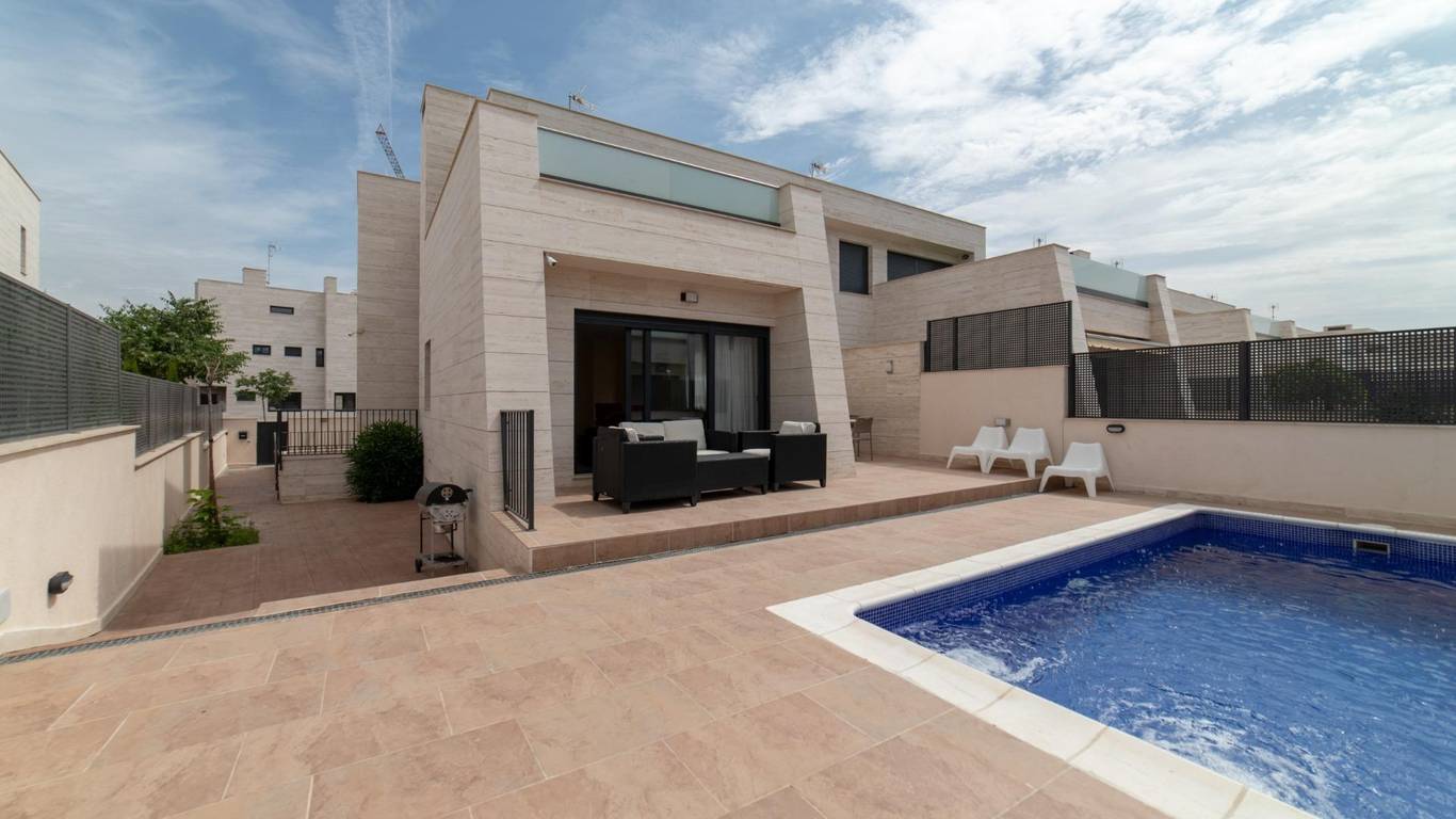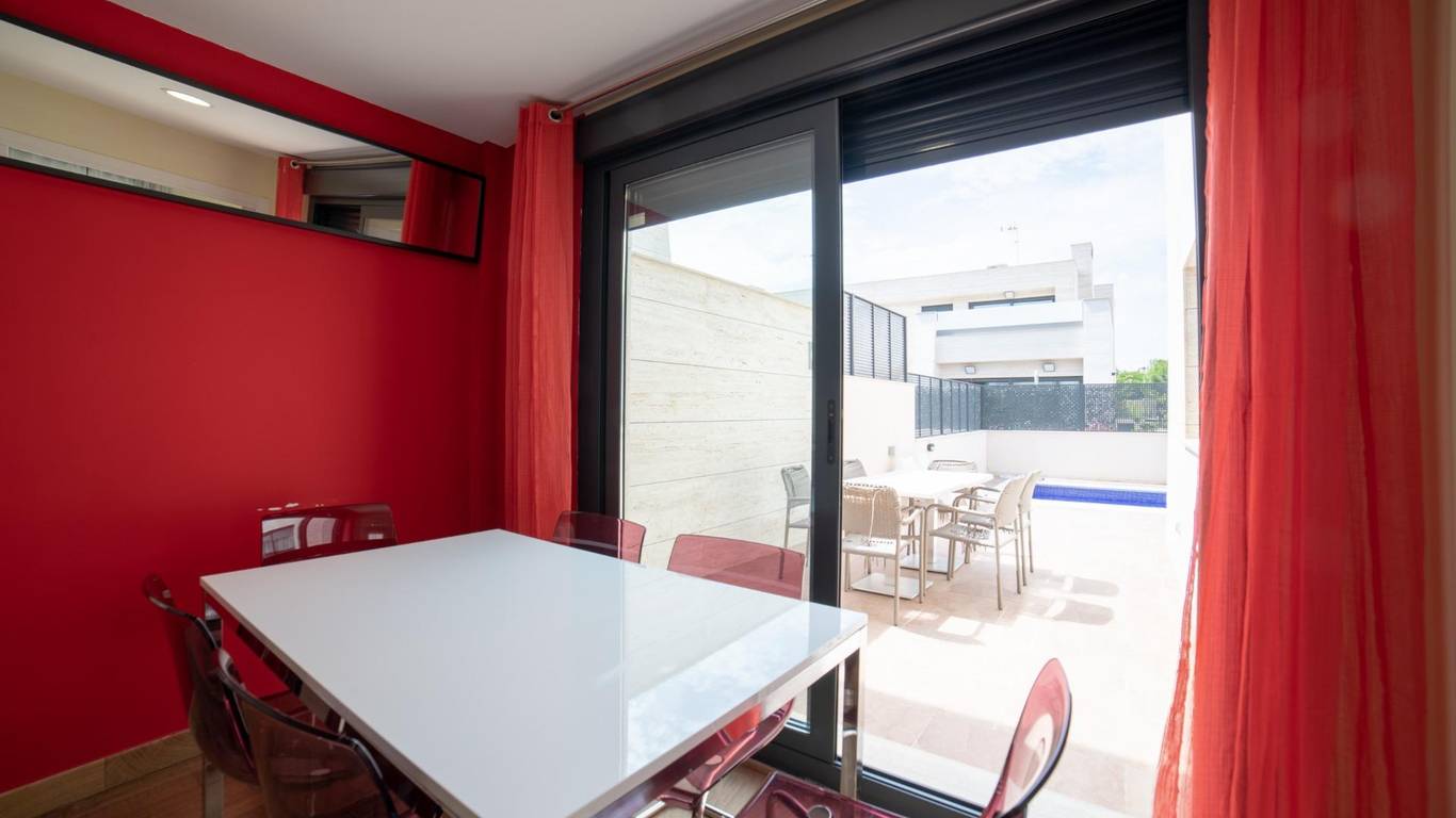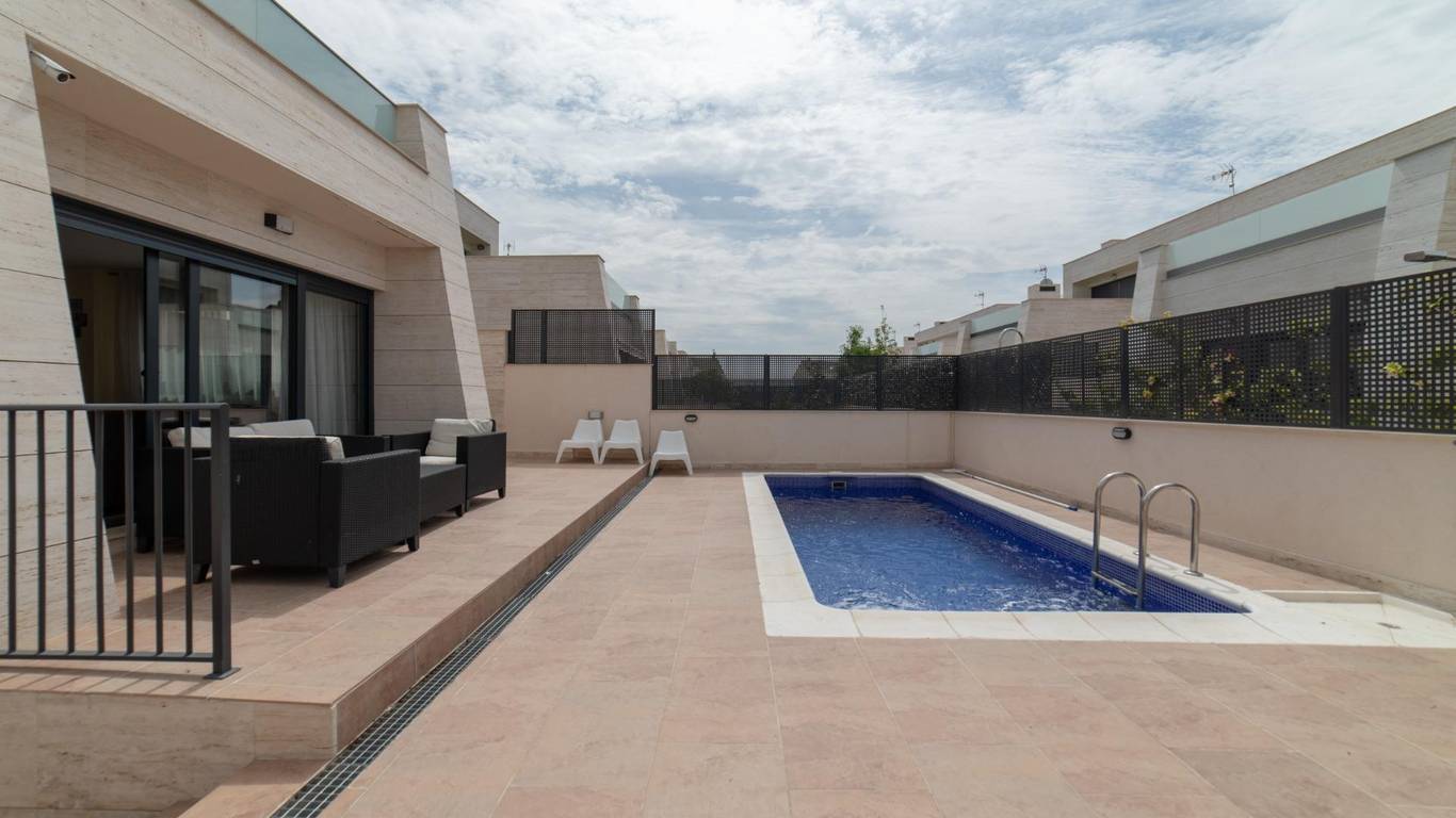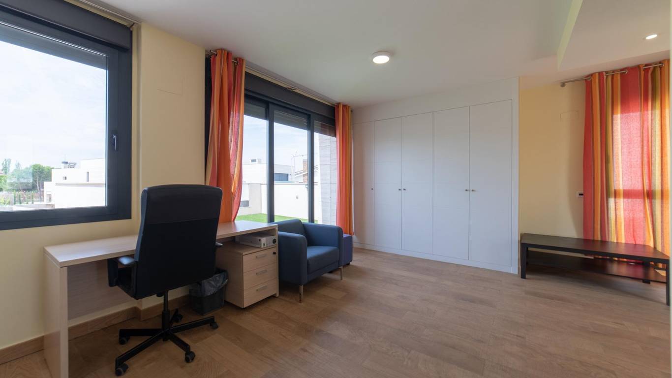 Exclusiva vivienda unifamiliar pareada con piscina en Villanueva de la Cañada Ubicada en Av. Argentina 42, en una de las zonas más tranquilas y residenciales de Villanueva de la Cañada (Madrid), esta magnífica propiedad combina diseño, amplitud y altas calidades en una parcela de 362 m con piscina privada. Superficie construida: 318 m - Distribuida en tres plantas: - Planta baja: 131,08 m - Planta ático: 46,62 m - Planta sótano: 140,35 m Distribución y estancias - Planta baja Acceso desde jardín privado y rampa para vehículos hacia el garaje Hall de entrada con patio de luces Escalera de comunicación interior 3 dormitorios, todos con baño en suite Aseo de cortesía Amplio salón-comedor con salida directa al jardín y piscina Cocina independiente con acceso al jardín Lavadero - Planta primera (ático) Hall con acceso a terraza Dormitorio principal con baño en suite y terraza privada - Planta sótano 2 dormitorios, cada uno con baño en suite y salida a patio inglés común Hall de distribución con patio de luz Garaje para 2 coches Cuarto de instalaciones y sala de depuradora Cuarto multiusos con luz y ventilación natural - Características y calidades Revestimientos y solados Porcelanosa Suelo radiante frío/calor mediante aerotermia Daikin Caldera de gas Ariston para ACS y calefacción por suelo radiante Placa solar de apoyo para ACS con depósito de gran capacidad, preparada para abastecer hasta 6 baños de forma simultánea Cocina totalmente equipada Fachada de mármol travertino Persianas eléctricas Depuradora para piscina Una vivienda pensada para quienes buscan confort, eficiencia energética y un entorno privilegiado, perfecta para familias que valoran el espacio y la calidad de vida.