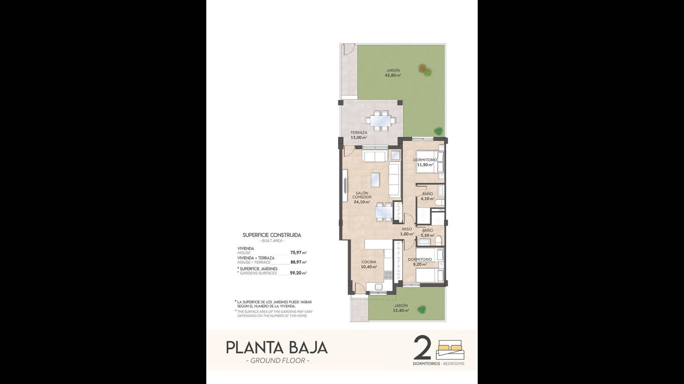 New Build Bungalows in San Miguel de Salinas Nature, Golf and ComfortDiscover this new residential development in San Miguel de Salinas, located in the sought-after area of La Cañada, surrounded by a protected pine forest between the prestigious golf courses of Campoamor and Las Colinas. Just 7 km from the Mediterranean coast, this residential offers the perfect blend of tranquility, nature, and easy access to all amenities.Spacious and Modern HomesThe development offers two property types to suit different lifestyles:Ground floor bungalows: 2 bedrooms, 2 bathrooms, two large private gardens, and surface parking.Top floor bungalows: 2 bedrooms, 2 bathrooms, spacious solarium with sea views, and surface parking.Each home features generous dimensions and can be adapted into a 3-bedroom layout (optional at an extra cost), with kitchen appliances included.High-Quality FinishesDesigned for comfort and functionality, all properties include:Fully equipped bathrooms with furniture, mirrors, and shower screensAerothermal hot water systemBuilt-in LED ceiling lightsExclusive Community AreasThe residential features over 1,700 m2 of landscaped green areas with palm trees and Mediterranean plants. Residents can enjoy a large swimming pool with jacuzzi, a childrens pool, and sunbathing areas, making it the ideal setting to enjoy the Costa Blanca climate all year round.Privileged Location in San Miguel de SalinasThis quiet residential is located less than 3 km from the charming town of San Miguel de Salinas, with all daily services at hand. In addition, beautiful sandy beaches in Orihuela Costa and Torrevieja are only 7 km away, offering endless leisure, shopping, and dining options.Close to Renowned Golf CoursesFor golf enthusiasts, the location is unbeatable. Within a 4 km radius you will find three of the most prestigious golf courses on the Costa Blanca:Villamartín Golf 3.5 kmLas Colinas Golf Country Club 4 kmCampoamor Golf 4 kmExcellent ConnectivityKey points of interest nearby include:San Miguel de Salinas 3 kmLa Zenia Boulevard Shopping Centre 10 kmAlicante Airport 55 kmMurcia Airport (Corvera) 50 kmSecure Your New Home in San Miguel de SalinasWhether you are looking for a permanent residence, a holiday retreat, or an investment opportunity, these new build bungalows offer excellent value in one of the most desirable areas of the Costa Blanca. Contact us today for more information and to arrange a visit.