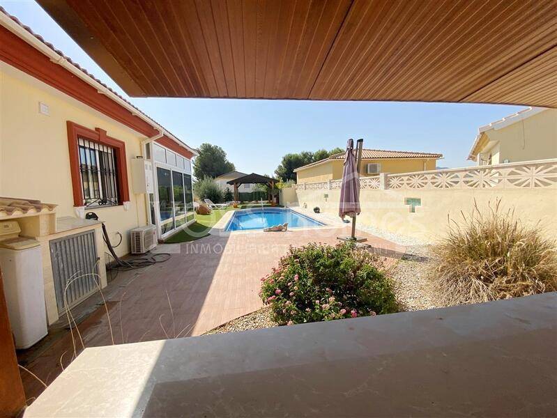 To the left you have the 8x4 swimming pool and shower and covered wooden pergola ideal for shade. There is an outside bar area and further on a path then leads round the rear of the villa to the meshed conservatory and BBQ area.