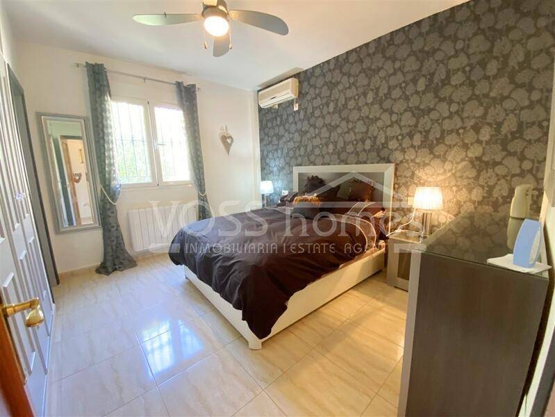 At the front of the villa is a covered glassed conservatory and double glass doors leading in to the large and spacious lounge with hot & cold air-con and pellet burner. Just off the lounge you have the recently new fitted kitchen. There is then a hall way and to the left, you have the master bedroom again with H&C A/C with fitted wardrobes and ensuite shower room.