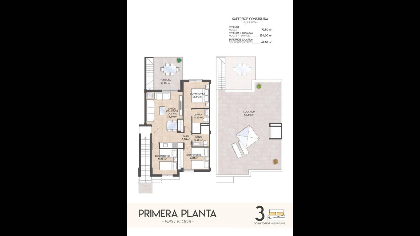 New Build Bungalows in San Miguel de Salinas Nature, Golf and ComfortDiscover this new residential development in San Miguel de Salinas, located in the sought-after area of La Cañada, surrounded by a protected pine forest between the prestigious golf courses of Campoamor and Las Colinas. Just 7 km from the Mediterranean coast, this residential offers the perfect blend of tranquility, nature, and easy access to all amenities.Spacious and Modern HomesThe development offers two property types to suit different lifestyles:Ground floor bungalows: 2 bedrooms, 2 bathrooms, two large private gardens, and surface parking.Top floor bungalows: 2 bedrooms, 2 bathrooms, spacious solarium with sea views, and surface parking.Each home features generous dimensions and can be adapted into a 3-bedroom layout (optional at an extra cost), with kitchen appliances included.High-Quality FinishesDesigned for comfort and functionality, all properties include:Fully equipped bathrooms with furniture, mirrors, and shower screensAerothermal hot water systemBuilt-in LED ceiling lightsExclusive Community AreasThe residential features over 1,700 m2 of landscaped green areas with palm trees and Mediterranean plants. Residents can enjoy a large swimming pool with jacuzzi, a childrens pool, and sunbathing areas, making it the ideal setting to enjoy the Costa Blanca climate all year round.Privileged Location in San Miguel de SalinasThis quiet residential is located less than 3 km from the charming town of San Miguel de Salinas, with all daily services at hand. In addition, beautiful sandy beaches in Orihuela Costa and Torrevieja are only 7 km away, offering endless leisure, shopping, and dining options.Close to Renowned Golf CoursesFor golf enthusiasts, the location is unbeatable. Within a 4 km radius you will find three of the most prestigious golf courses on the Costa Blanca:Villamartín Golf 3.5 kmLas Colinas Golf Country Club 4 kmCampoamor Golf 4 kmExcellent ConnectivityKey points of interest nearby include:San Miguel de Salinas 3 kmLa Zenia Boulevard Shopping Centre 10 kmAlicante Airport 55 kmMurcia Airport (Corvera) 50 kmSecure Your New Home in San Miguel de SalinasWhether you are looking for a permanent residence, a holiday retreat, or an investment opportunity, these new build bungalows offer excellent value in one of the most desirable areas of the Costa Blanca. Contact us today for more information and to arrange a visit.