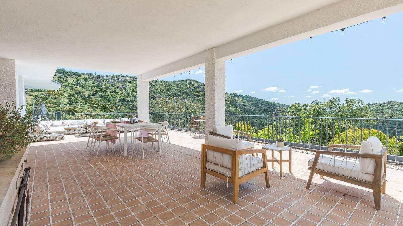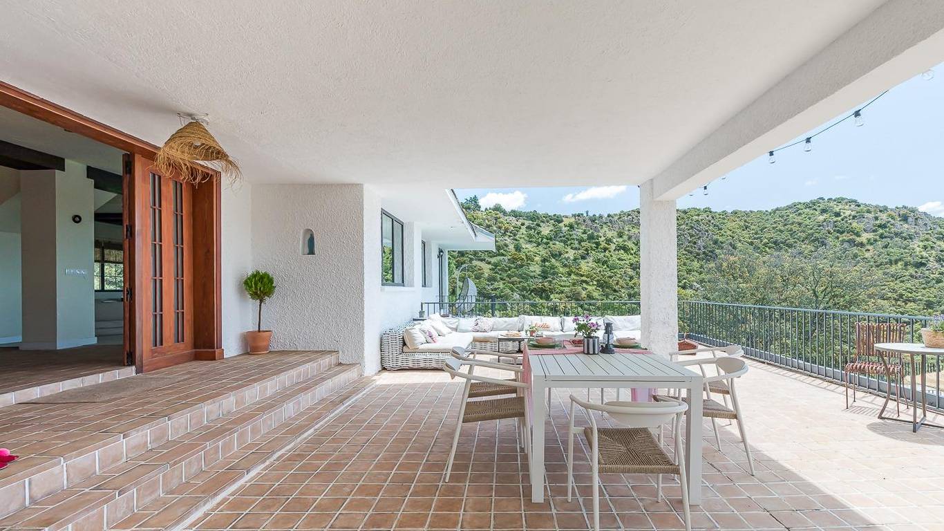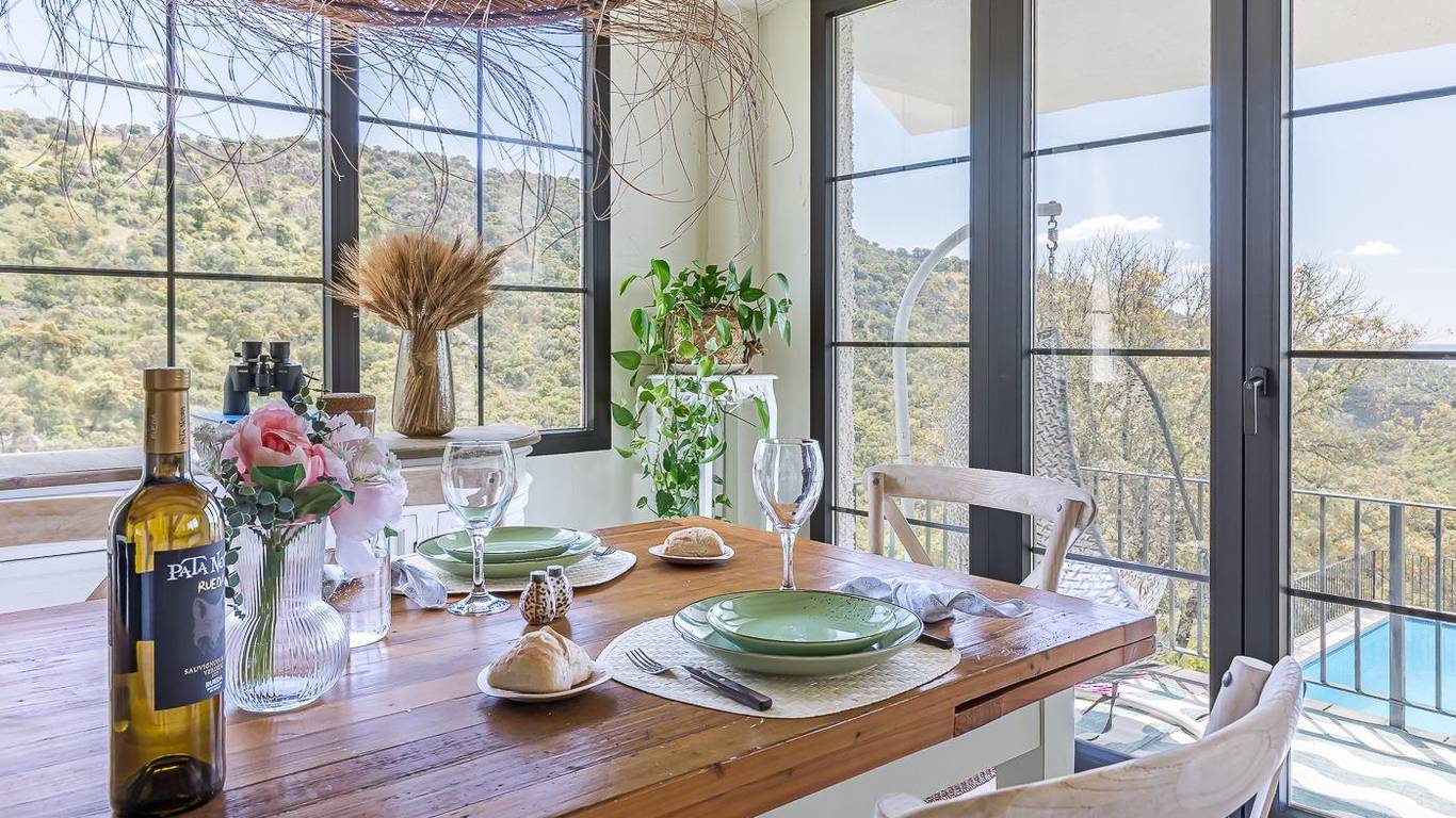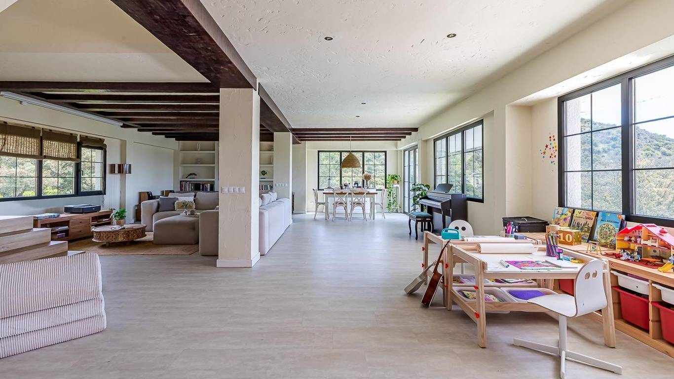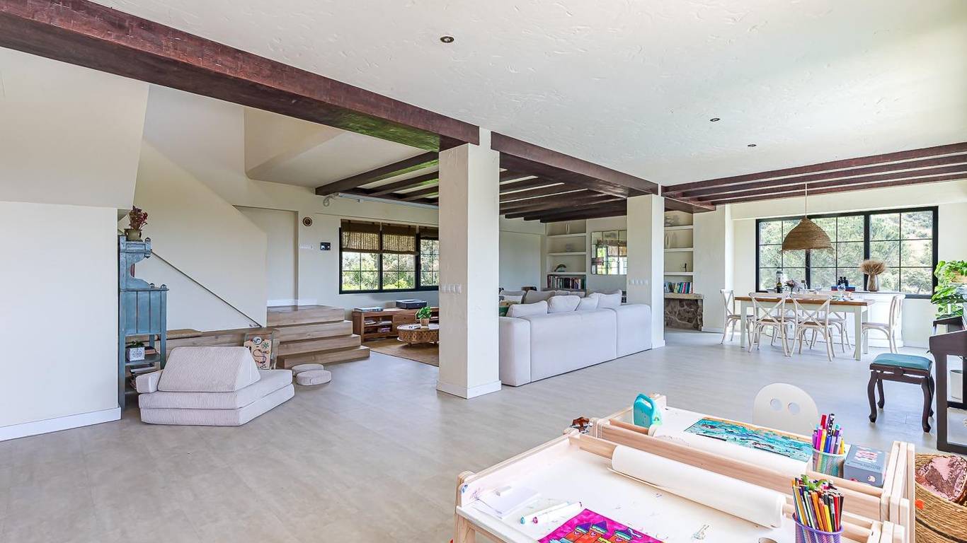 Desde el hall de la vivienda por la derecha llegamos a un amplísimo salón-comedor con una pequeña terraza con unas maravillosas vistas a la garganta del río Guadarrama, vistas que puedes divisar desde cualquier punto del salón.