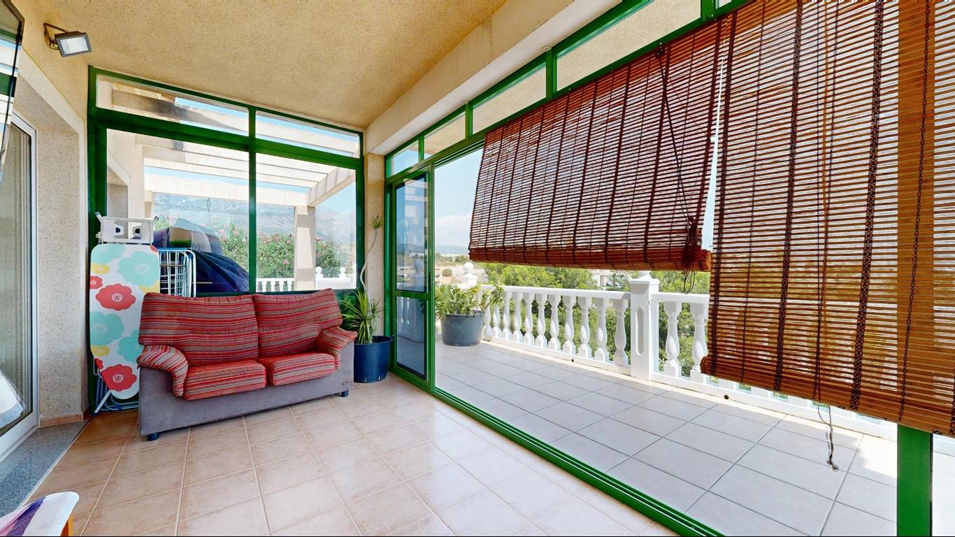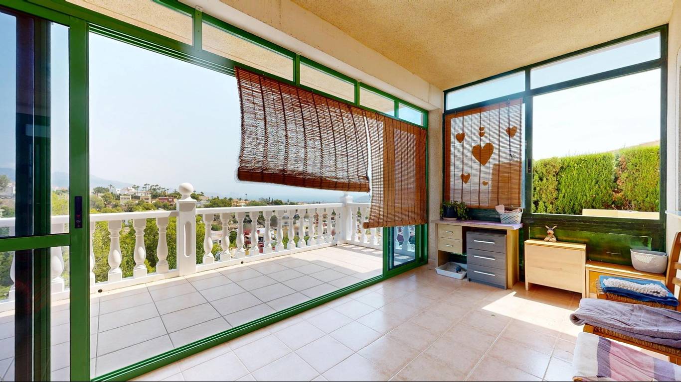 Amplio salón con terraza acristalada y vistas panorámicas al mar, perfecto para relajarse en un entorno luminoso y acogedor.