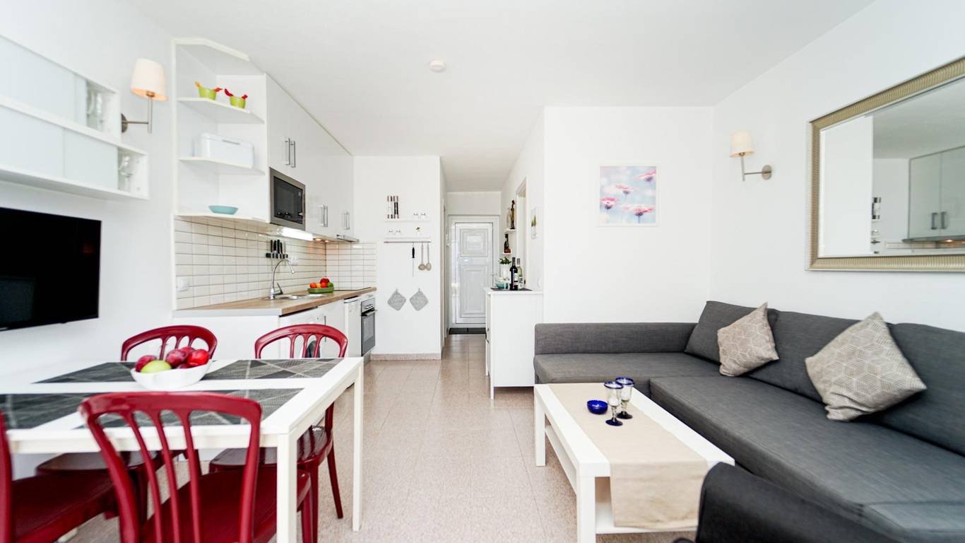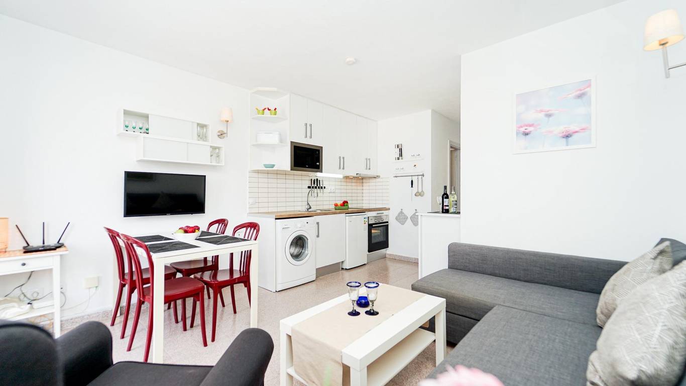 The property features one bedroom and has been carefully renovated with quality materials, creating a modern and comfortable atmosphere. The kitchen is conveniently integrated into the living room, and the spacious private terrace, sheltered and sunny almost all day, is the ideal place to enjoy the Canary climate: having breakfast outdoors, sunbathing in privacy, or relaxing at sunset with spectacular views.