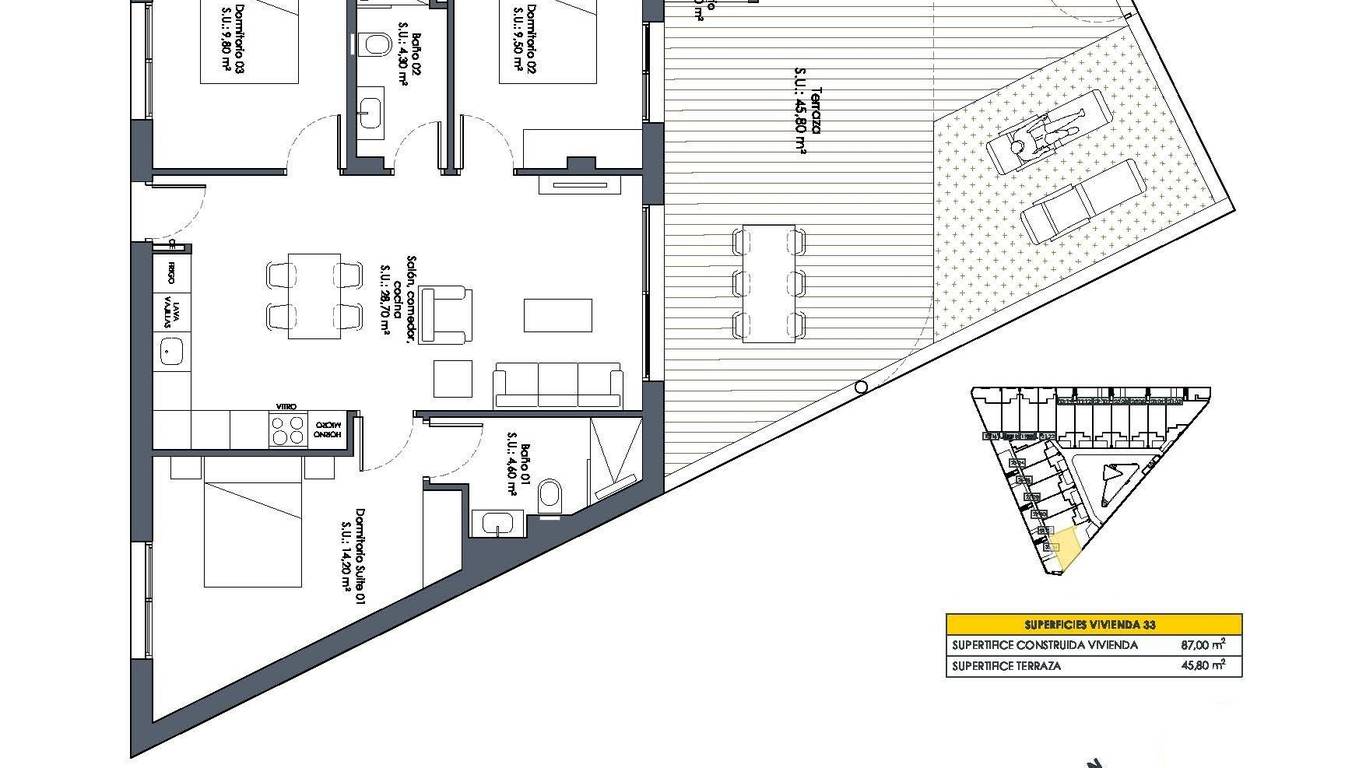 New Build Residential Complex in San FulgencioContemporary Apartments with Exceptional FeaturesDiscover this new residential development in San Fulgencio, offering 2 and 3-bedroom apartments designed for comfort, style, and convenience. The complex features:Ground-floor apartments with private gardensPenthouses with private solariums, pergolas, electrical outlets, and water pointsEach property includes a private parking space, and the development boasts a communal Mediterranean-style swimming pool with an 85 m water sheet, surrounded by beautifully landscaped gardens.High-Quality Finishes and Modern DesignThese homes are built with premium materials and modern features to ensure energy efficiency and a high standard of living:Electric blinds in bedroomsDouble-glazed exterior carpentry with thermal break technologyFully equipped bathrooms with vanity units, mirrors, and shower screensLED lighting throughout the propertyPre-installed ducted air conditioning for climate controlPrime Location Close to Beaches, Golf, and AmenitiesSan Fulgencio is a charming Spanish town with a selection of restaurants, shops, and essential services within walking distance. Its strategic location offers quick access to some of the best attractions on the Costa Blanca:Alicante-Elche International Airport 30 km (30 min)La Marina Beach 7 km (10 min)Guardamar del Segura 10 km (12 min)La Marquesa Golf Course (Ciudad Quesada) 6 km (8 min)Torrevieja city center 18 km (20 min)Shopping centers, restaurants, and leisure options within a short driveThe Ideal Home for Coastal LivingThis new development in San Fulgencio is perfect for those looking for a modern holiday home, an investment property, or a permanent residence on the Costa Blanca. With its excellent location near the beach, golf courses, and essential services, it offers a tranquil yet well-connected lifestyle.Dont miss the opportunity to own a brand-new home in San Fulgencio. Contact us today for more details or to schedule a visit