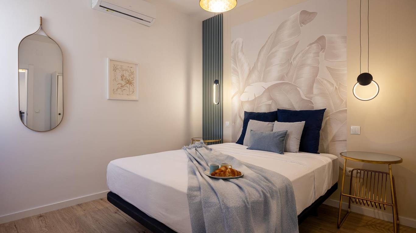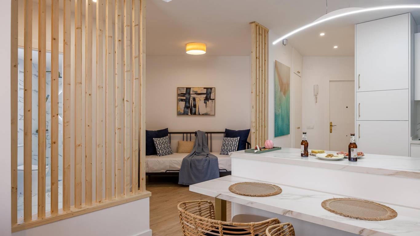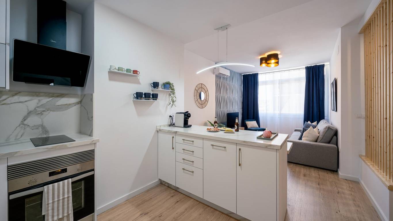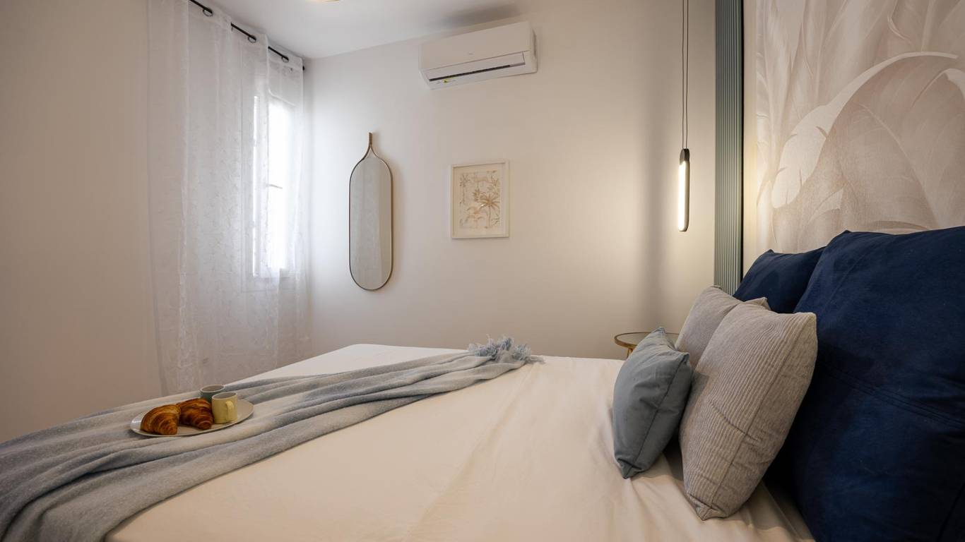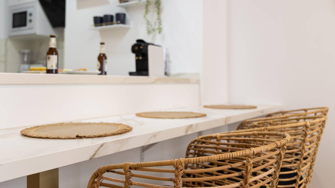 Our flat has one bedroom, a living room with an open-plan kitchen separated by a beautiful island that doubles as a dining table, air conditioning and a south-facing aspect that provides it with a special light, making it cosy and functional.