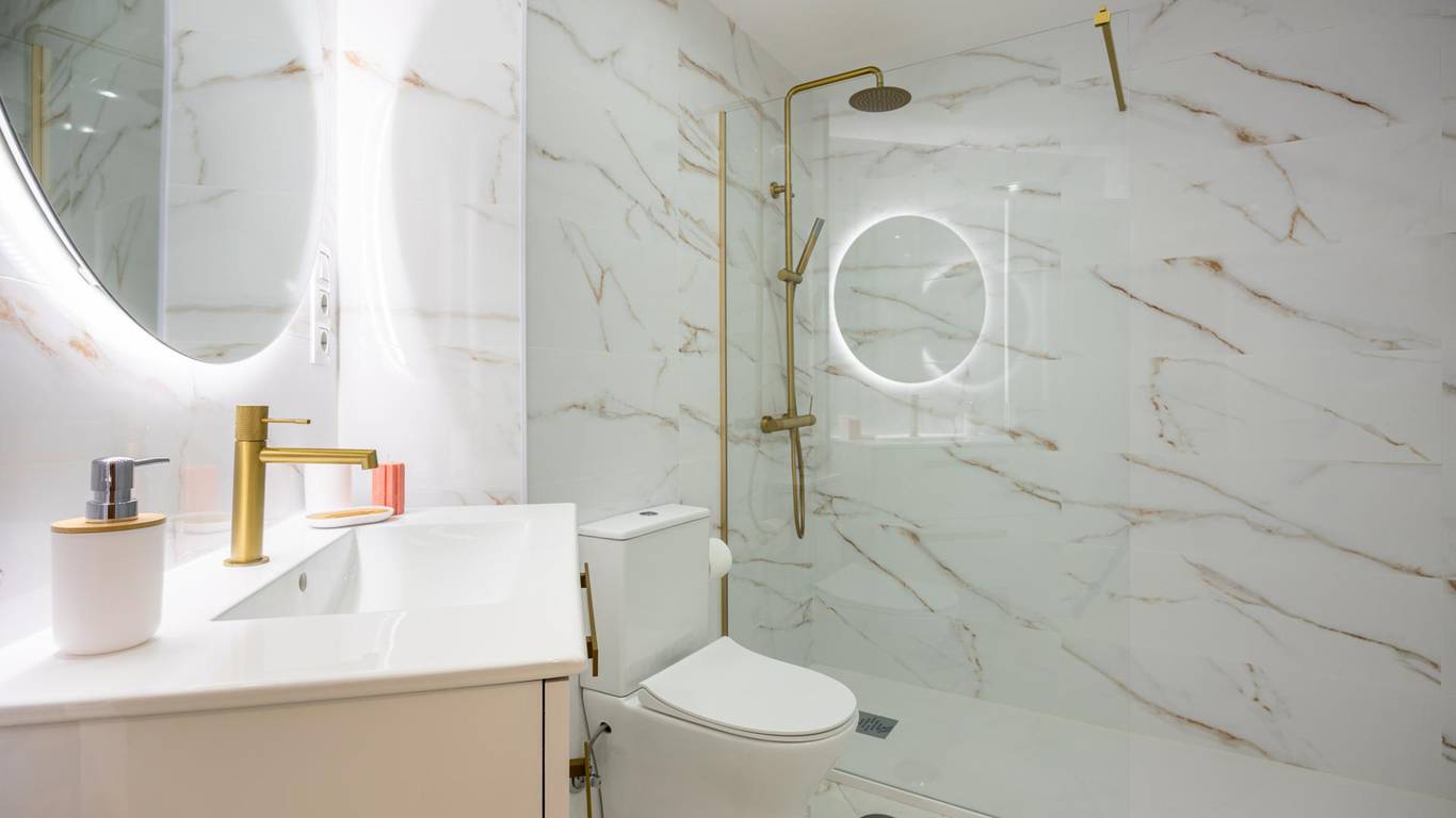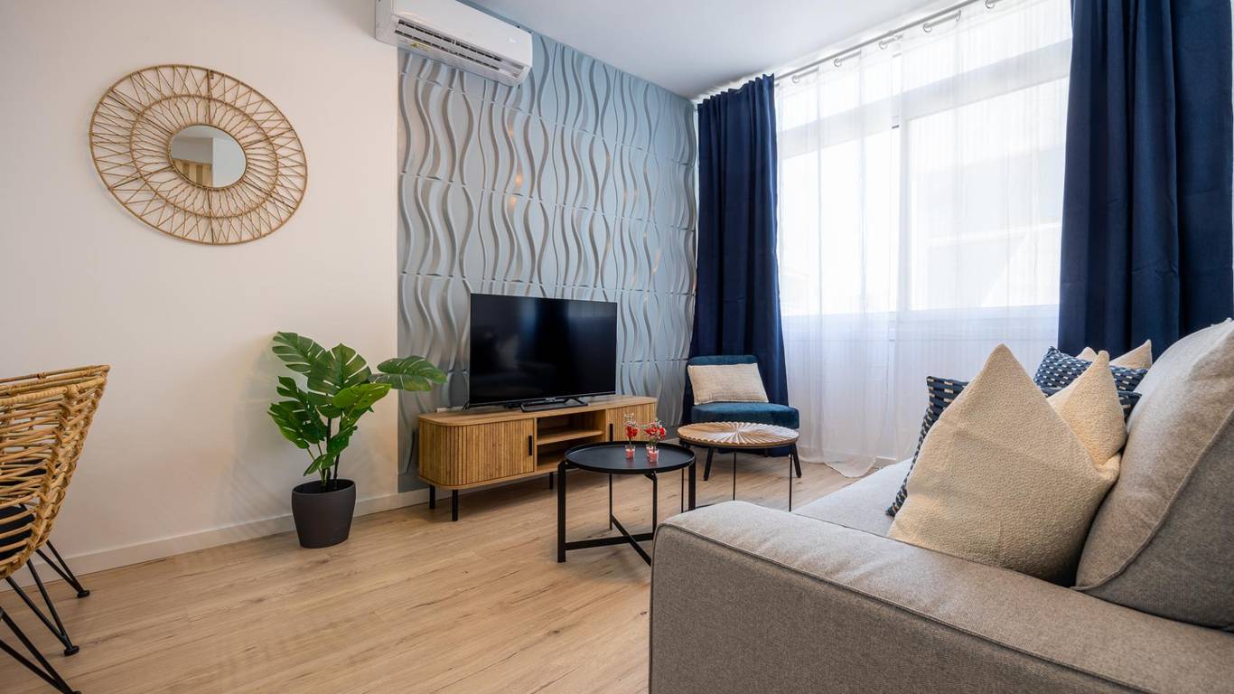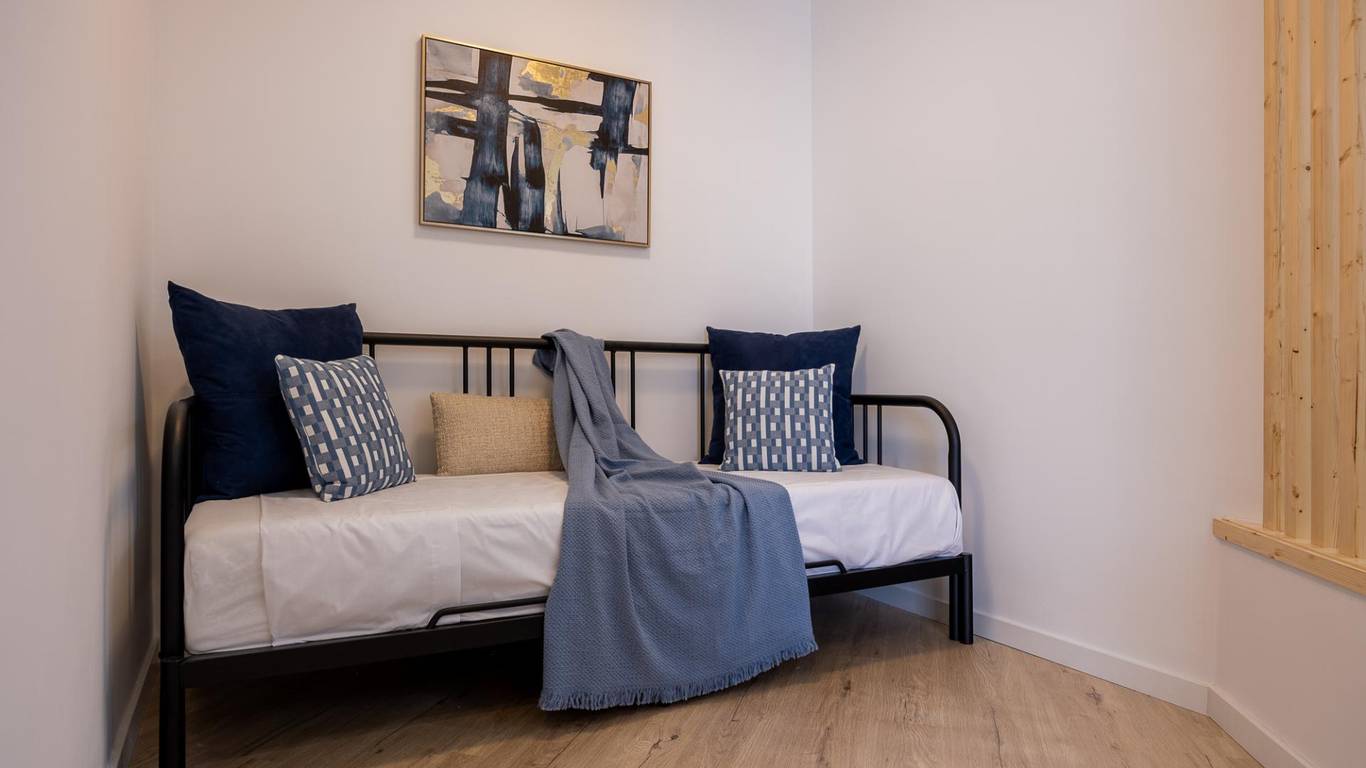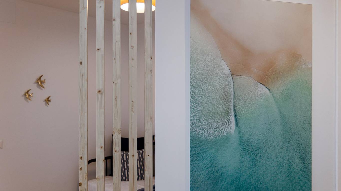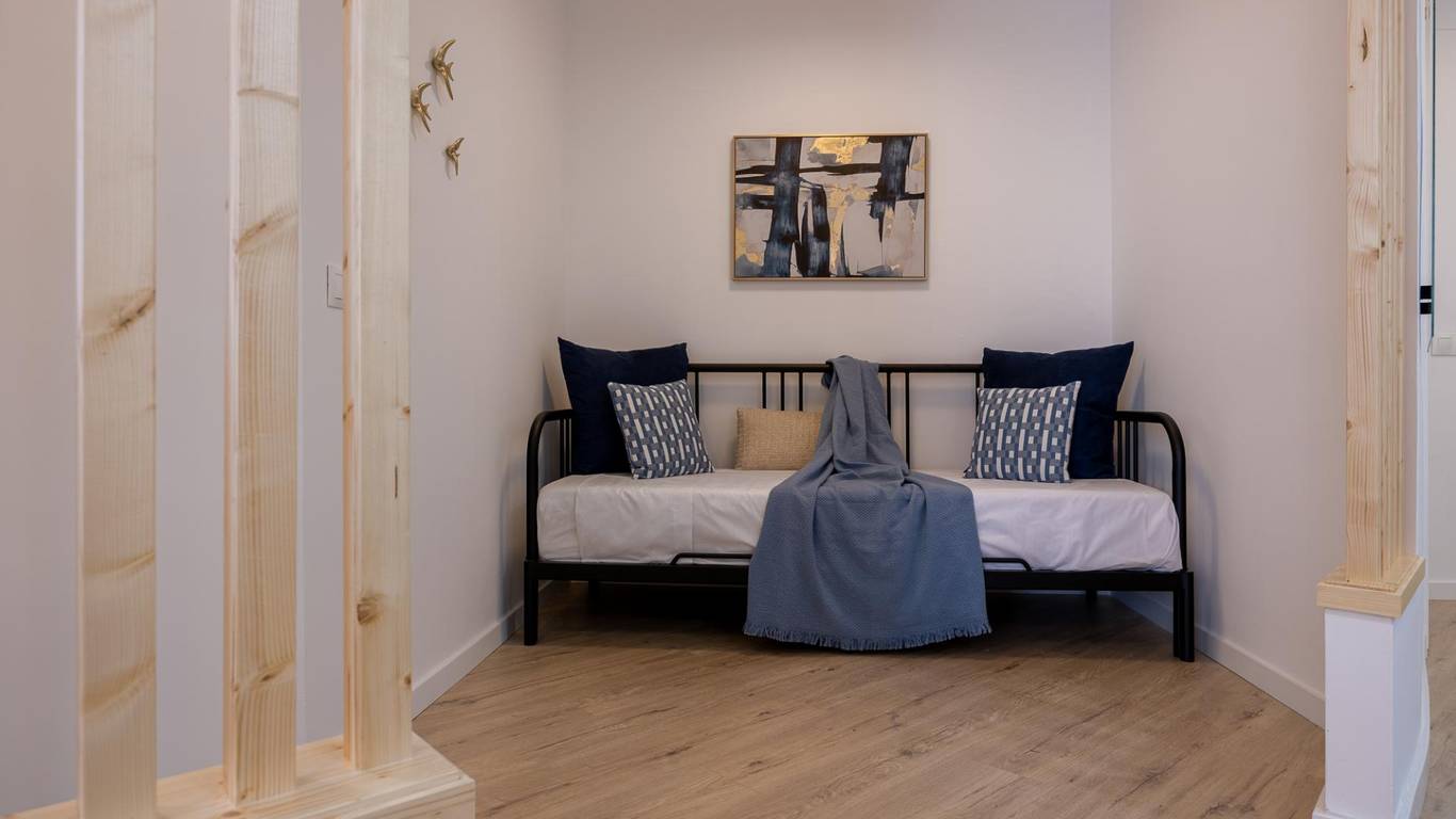 Our flat has one bedroom, a living room with an open-plan kitchen separated by a beautiful island that doubles as a dining table, air conditioning and a south-facing aspect that provides it with a special light, making it cosy and functional.