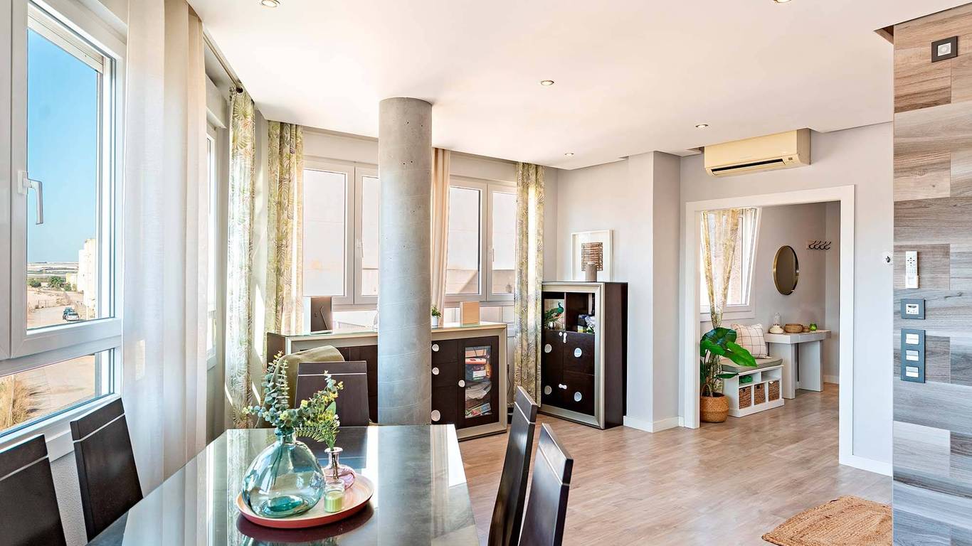 Los 10 ventanales del salón ofrecen unas vistas despejadas hacía el sur y el oeste que regala muchisima luz natural a esta vivienda que además tiene ventanas en cada habitación (baños también).