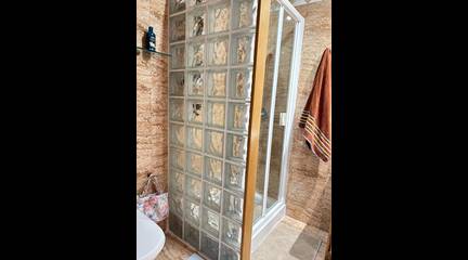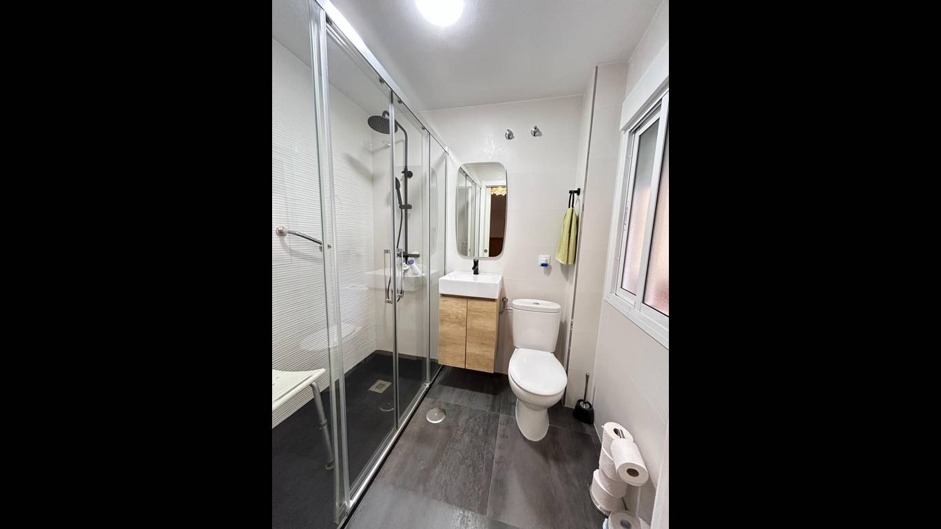 Baño completo con placa de ducha, de estilo actual y funcional.