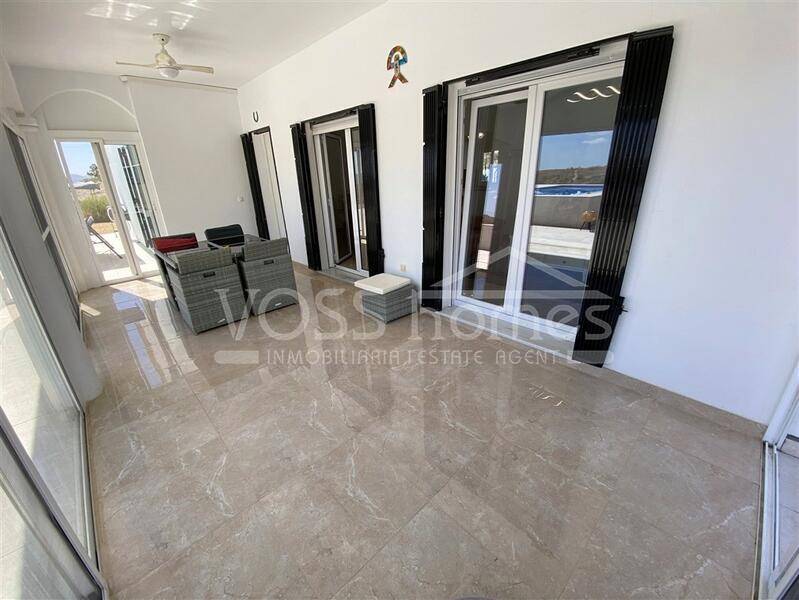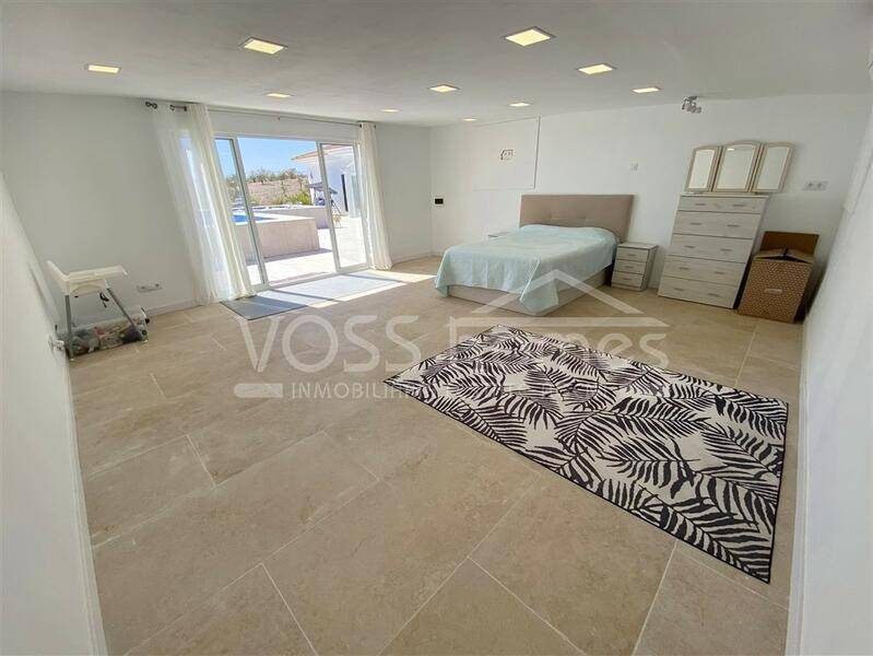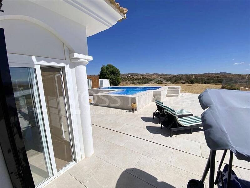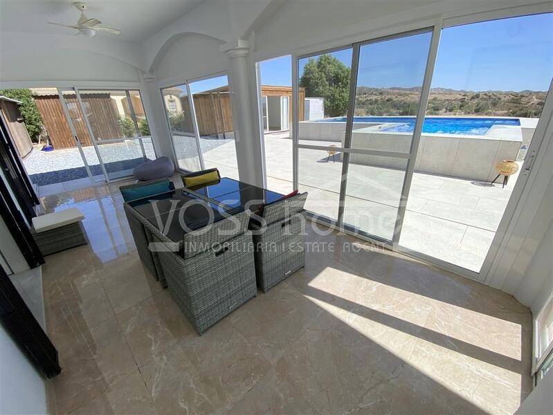 NUEVA Y EXCLUSIVA PROPIEDAD DE VOSS HOMES - VH2628 Villa Maida es una espaciosa villa de 3 dormitorios y 2 baños, recientemente reformada y modernizada, de 121 m², con invernadero acristalado. Cuenta con un gran chalet de madera que actualmente se utiliza como dormitorio de invitados, una impresionante piscina de 8 x 4 m con zona de jacuzzi, electricidad de red y solar, chalet independiente (cuarto dormitorio), cochera, 2 cobertizos y aire acondicionado frío/calor en un jardín vallado de fácil mantenimiento de 2815 m².