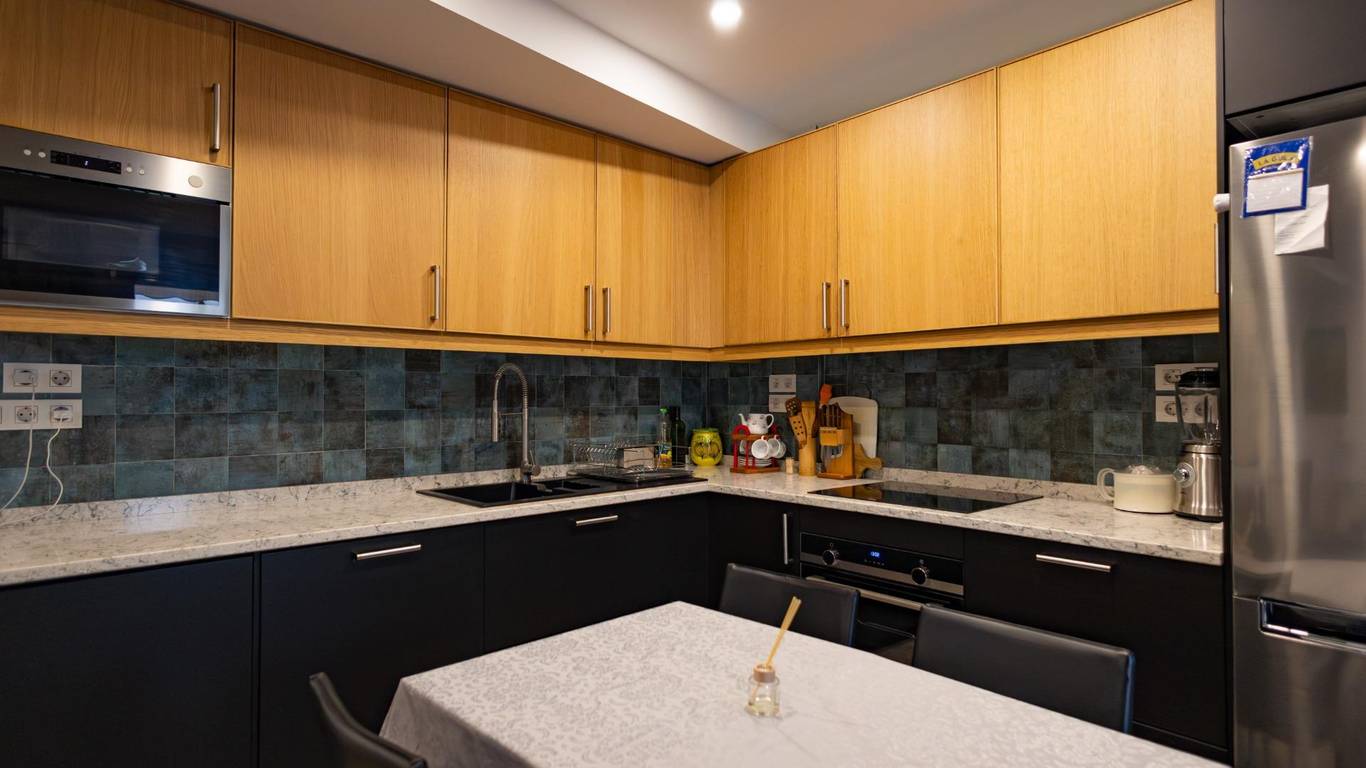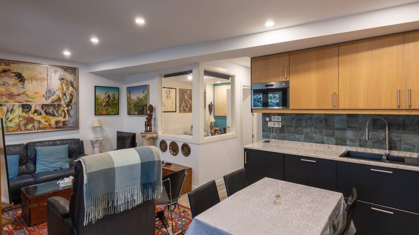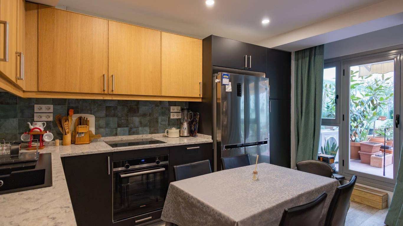 El área social se organiza en un concepto abierto, con un amplio salón-comedor conectado a una cocina americana de diseño moderno. Los acabados en madera natural, los tonos oscuros y la alta calidad de los materiales como el suelo de gres imitación madera y las ventanas Climalit garantizan calidez, funcionalidad y estilo en cada rincón.