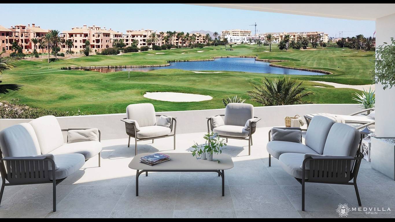 The detached villas are situated right on the front line of Serena Golf in Los Alcázares, offering residents stunning views of the green fairways and surrounding landscapes. From the upper floors and the solarium, the view extends across the sparkling waters of the Mar Menor.