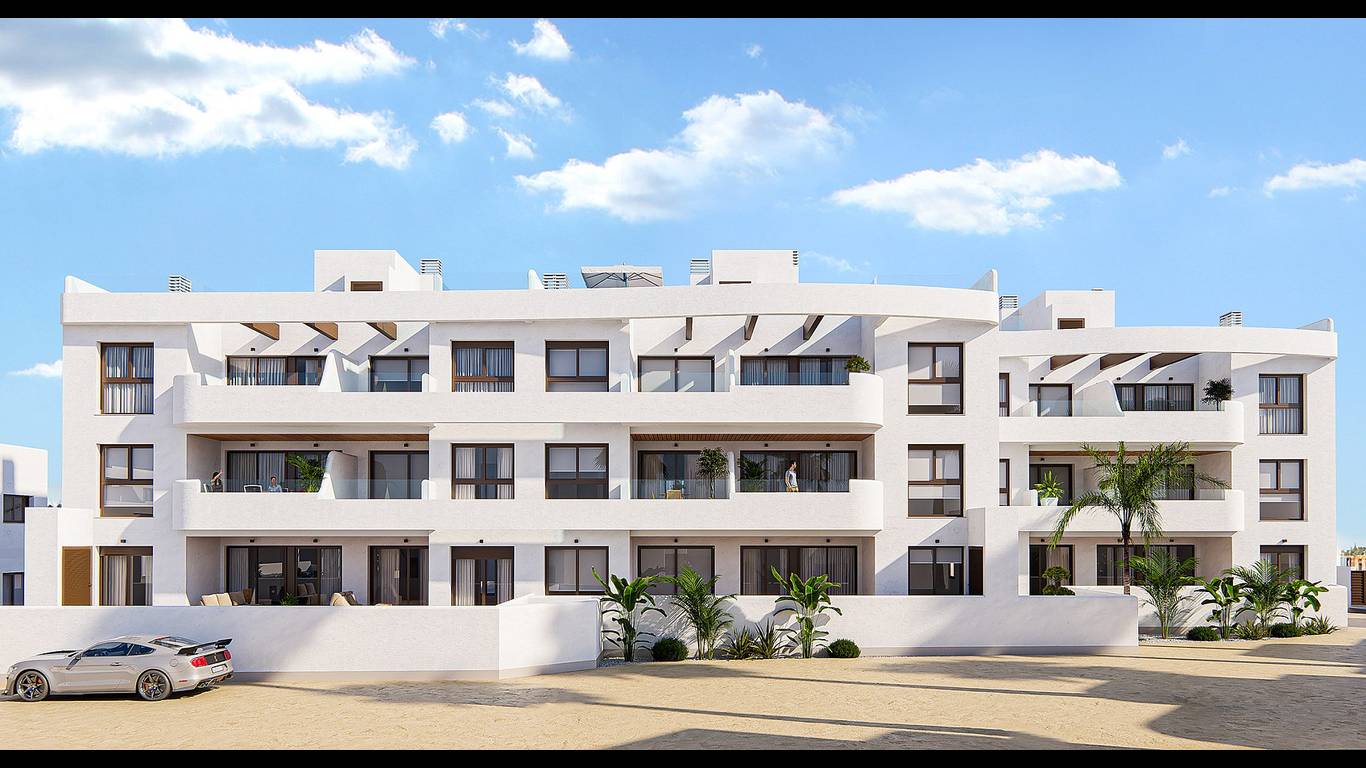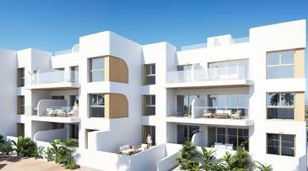 There are ground-floor apartments with a private terrace, first-floor apartments with a balcony, and penthouses with a balcony and a large private solarium.