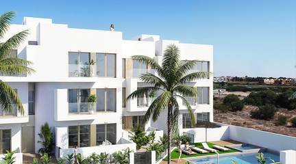 There are ground-floor apartments with a private terrace, first-floor apartments with a balcony, and penthouses with a balcony and a large private solarium.