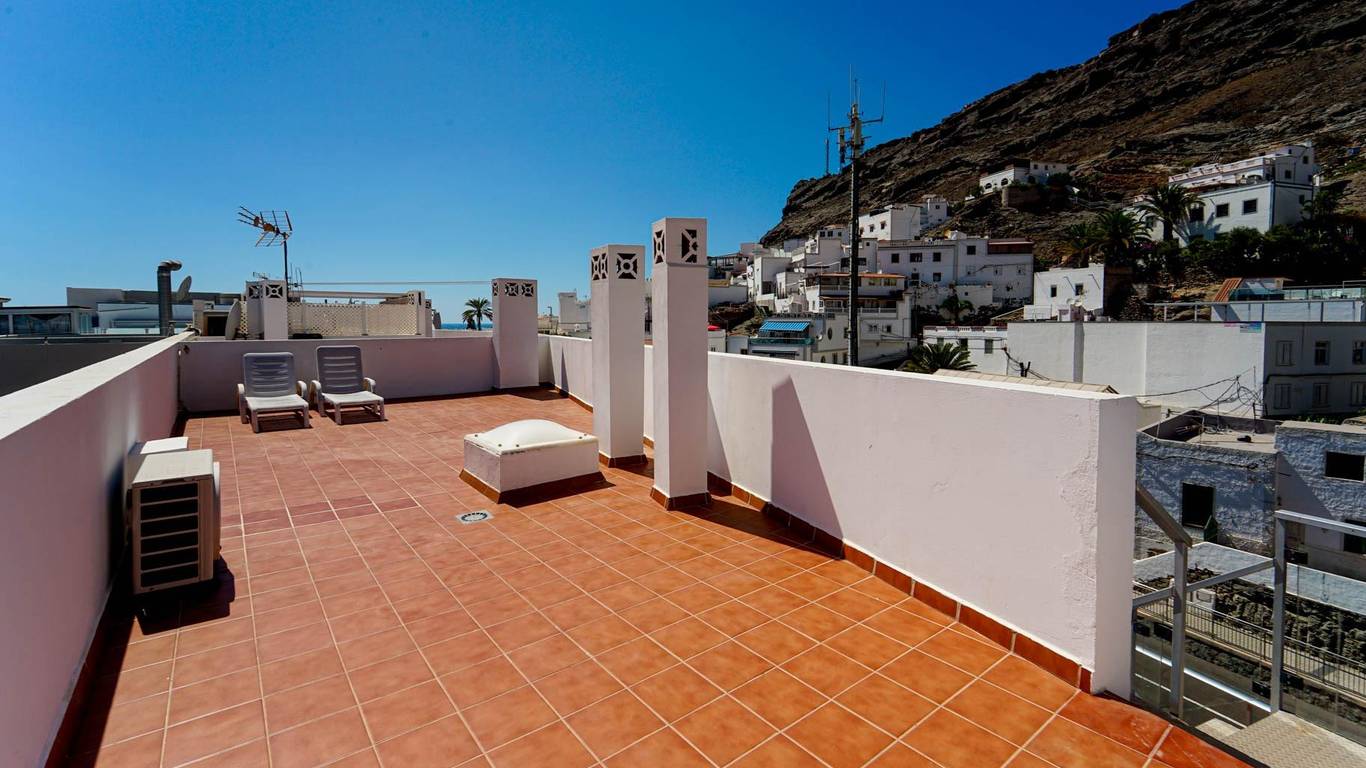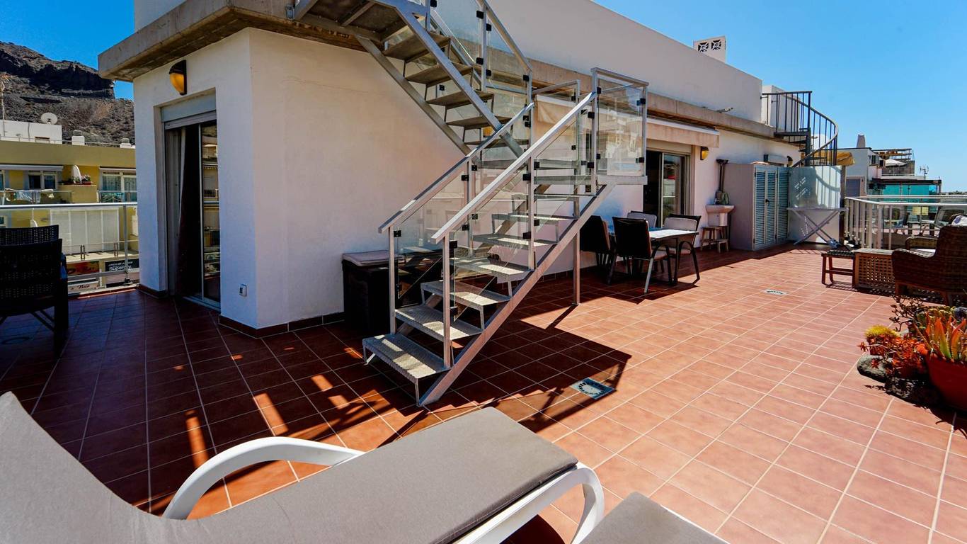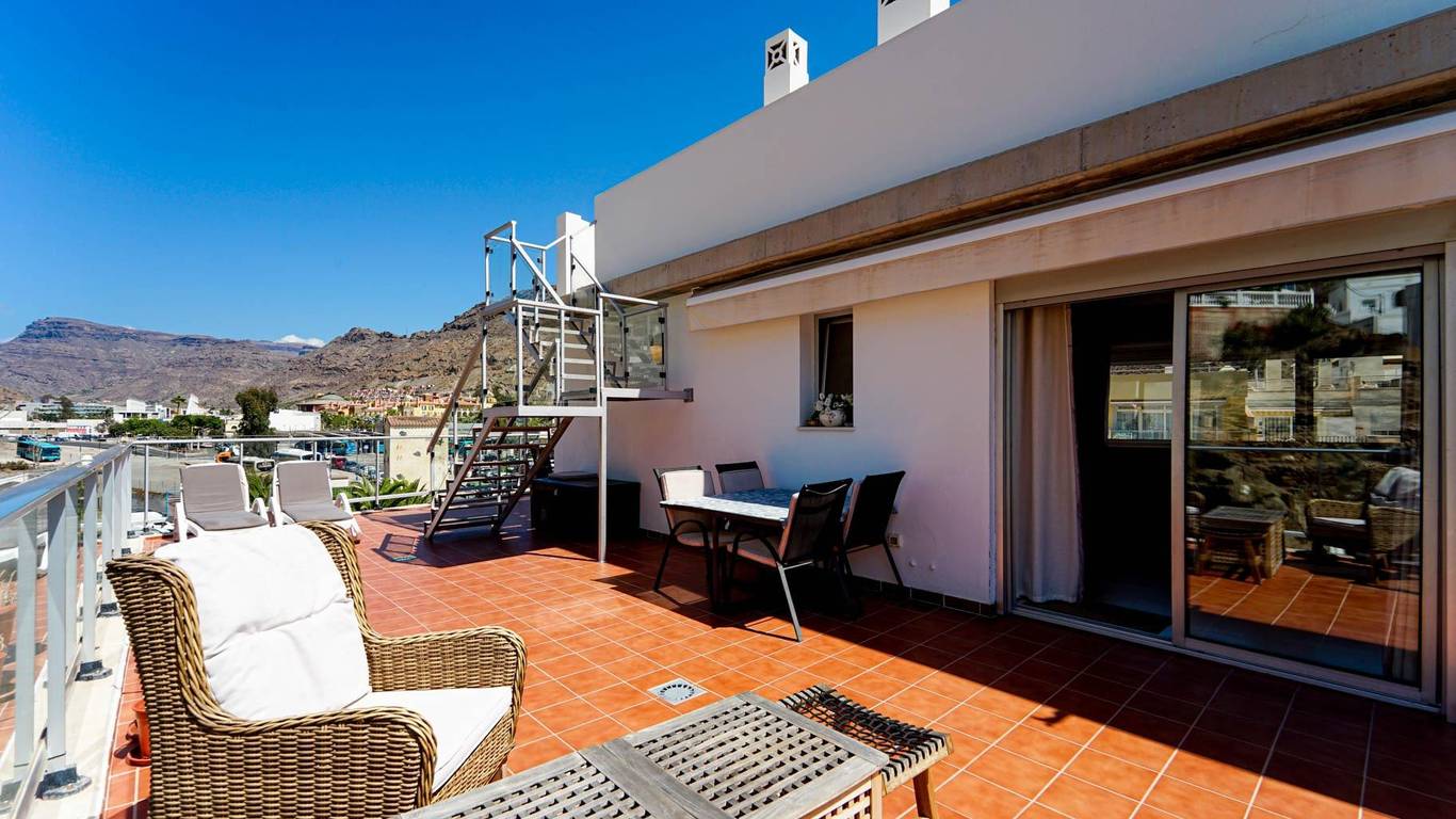 We present a unique property in an unbeatable location, just a few metres from Mogán Beach and next to the canal and marina. This exclusive corner penthouse stands out for its spectacular outdoor terrace and a spacious walkable rooftop with many possibilities. Together, both outdoor areas offer over 100 m of private space, a rare privilege in the area that allows you to enjoy the extraordinary climate of southern Gran Canaria to the fullest.