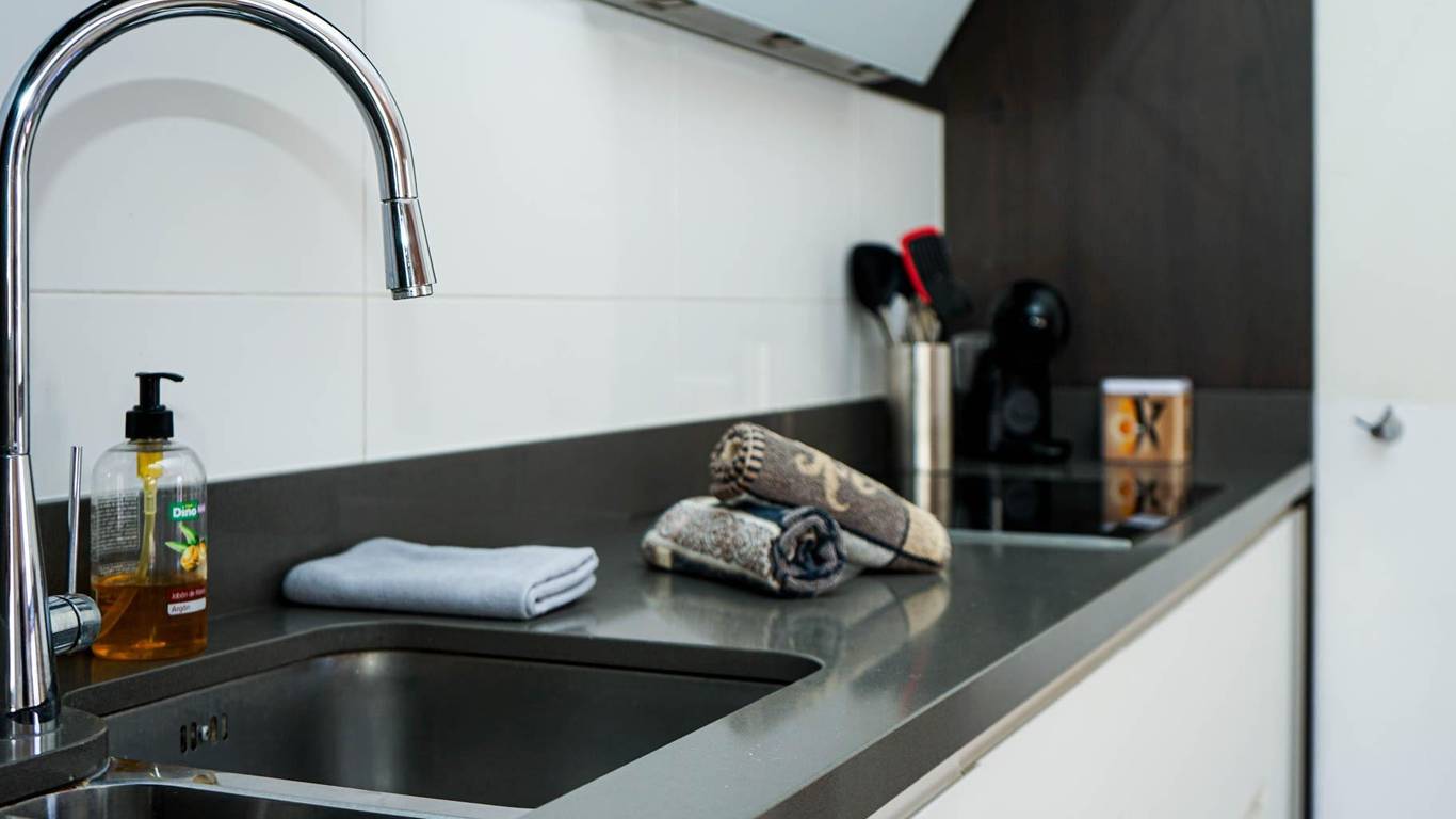 This penthouse is laid out on a single floor and features a spacious bedroom with access to the terrace, a bathroom, and an open-plan living room with kitchen.