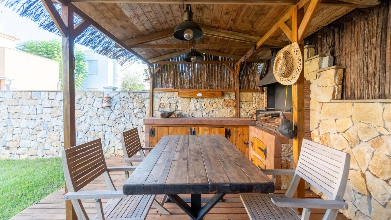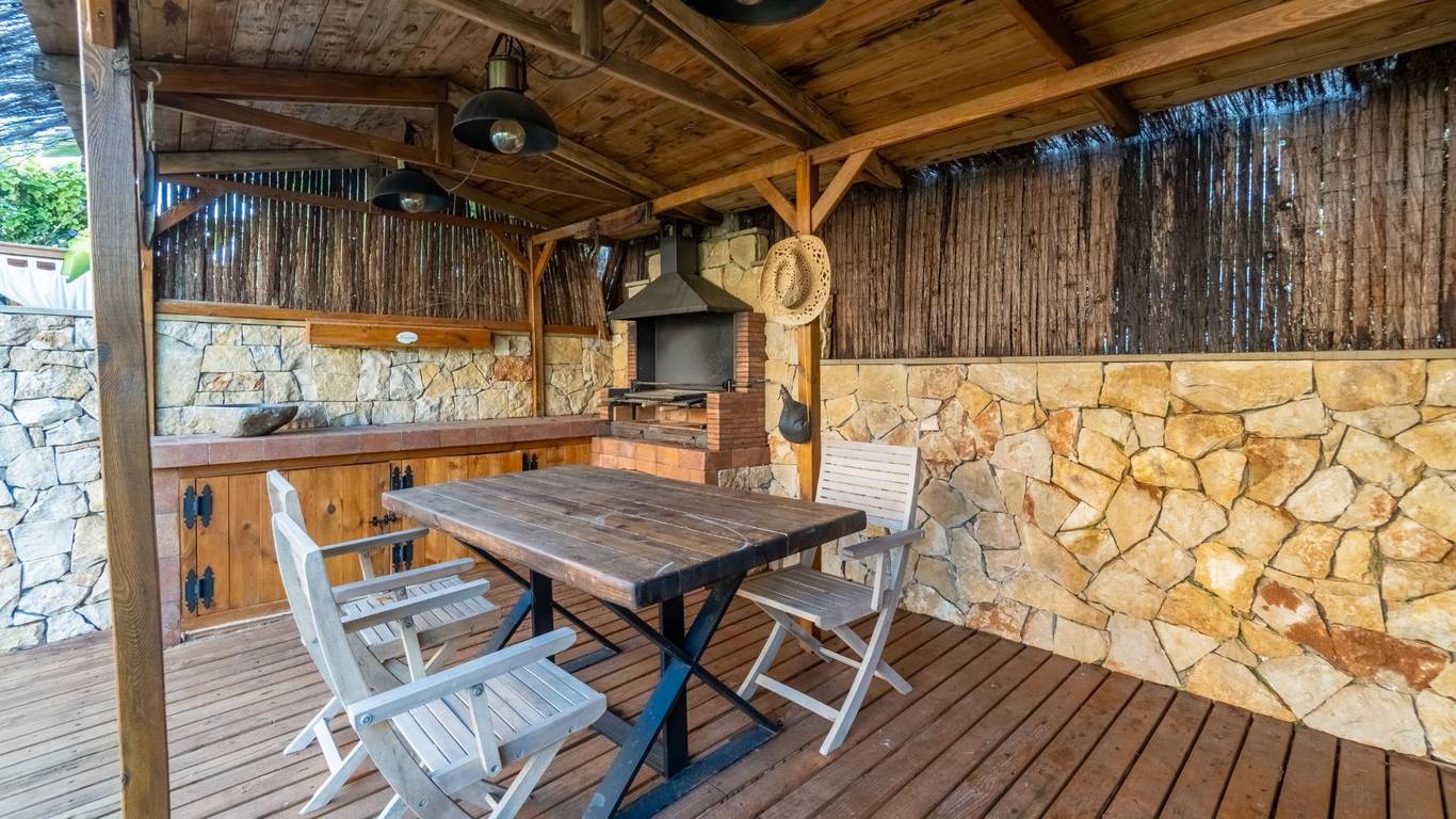The main floor features a living-dining room with a wood-burning fireplace, which brings warmth to the entire home and opens onto a terrace with a pool-spa, equipped with a wave system and temperature control for year-round use. The fully equipped separate kitchen connects to the living room and rear garden and can be integrated through a minor renovation.