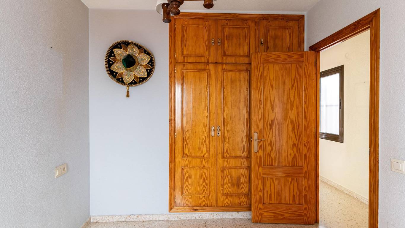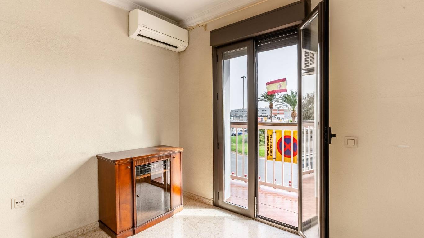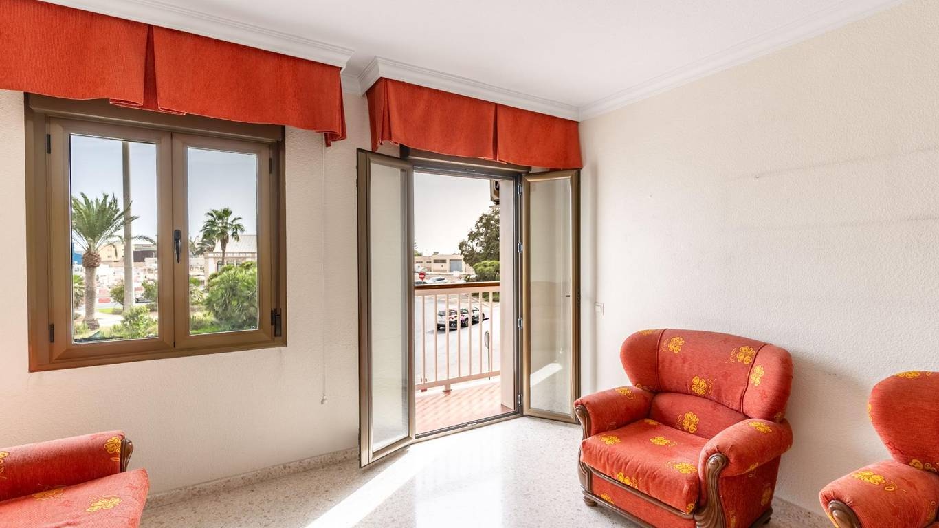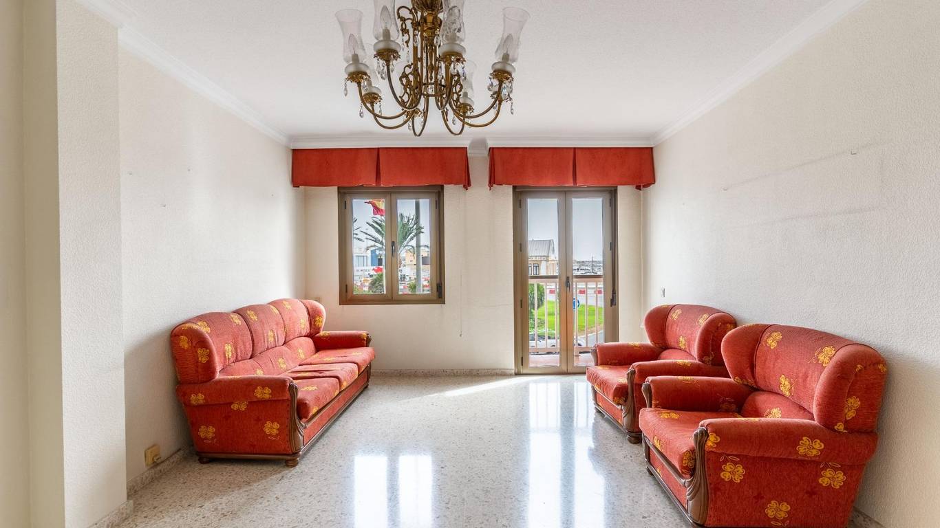 Upon entering, an elegant foyer with a built-in wood-paneled wardrobe welcomes you and defines the home's character. From there, you access a large, air-conditioned living room filled with natural light, with access to a balcony and unique views of the port of Almería, making every day a different experience.
