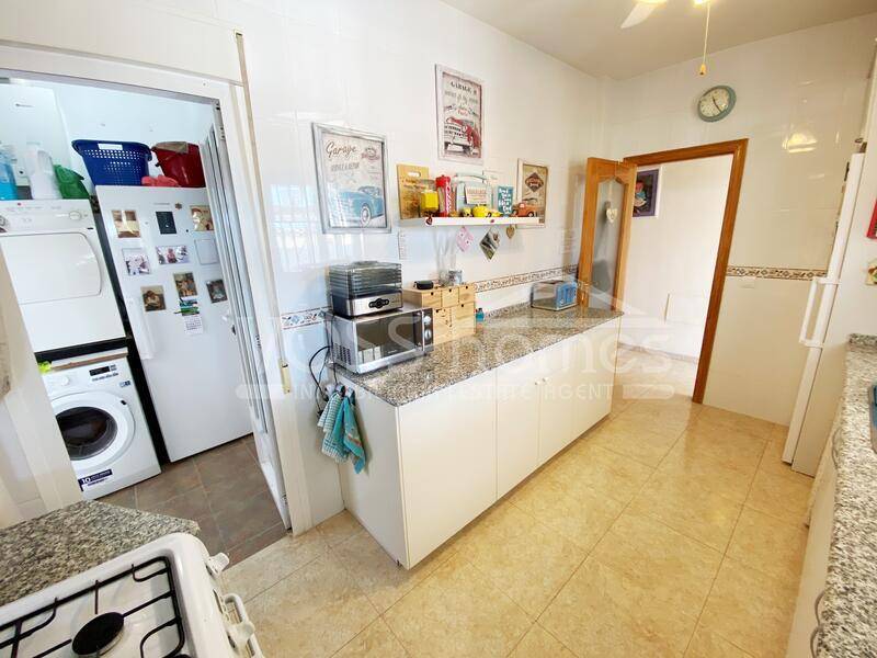 The front door then leads in to entrance hallway. To the left is the fitted kitchen with plenty of worktop & storage space. There is also a small utility room with door leading out to the rear of the villa. Back into the hallway to the right is the living room with H&C air con, ceiling fans and log burning fire.