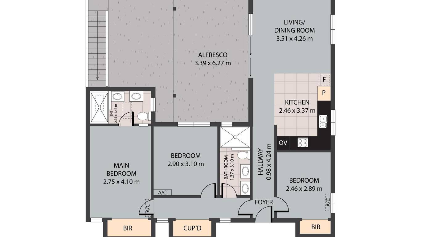 Living room-kitchen, two bathrooms, three bedrooms, and terraces.