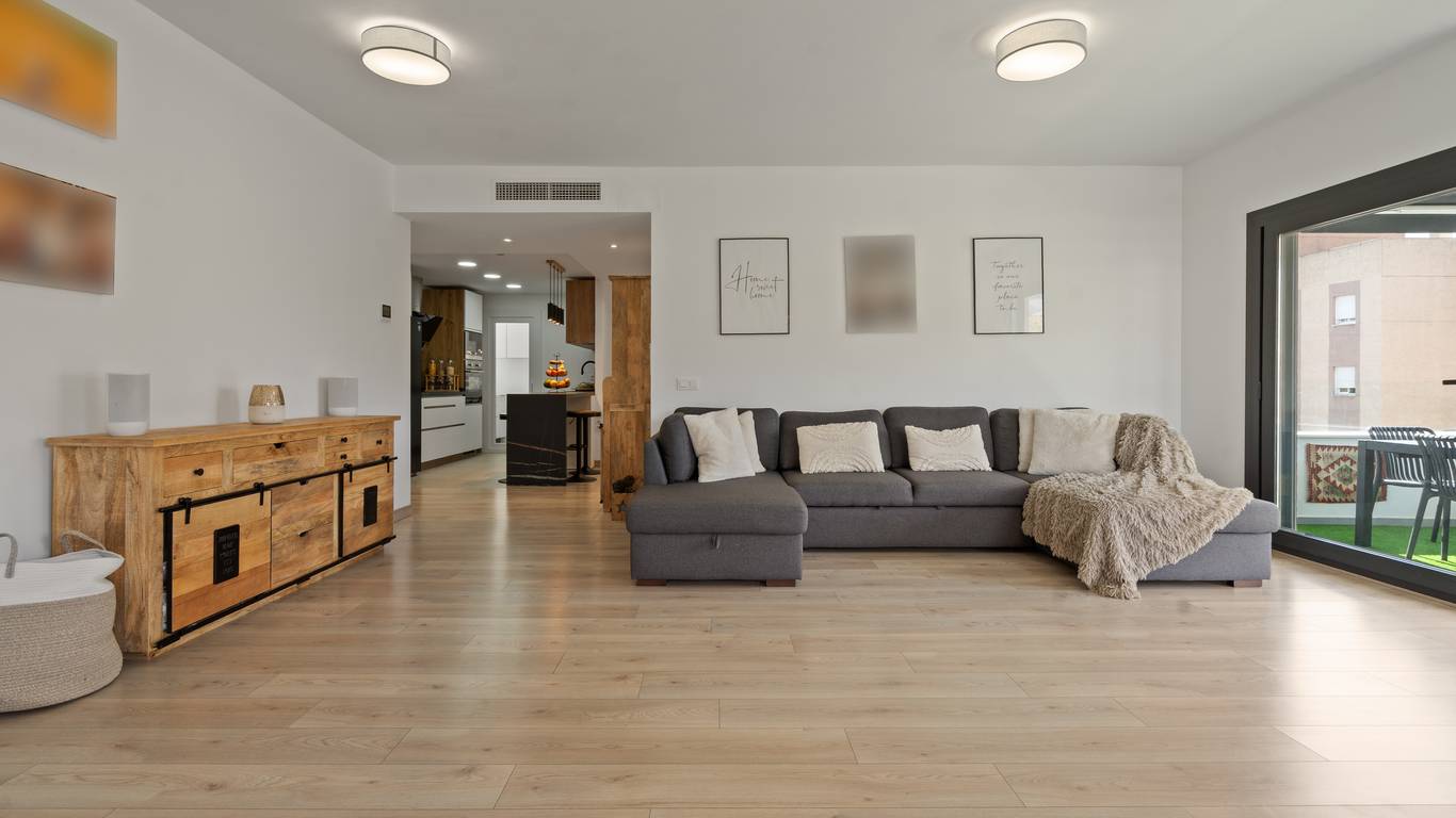 The spacious living room, with large windows opening onto the terrace, invites relaxation and the enjoyment of natural light that fills every space from morning to sunset.