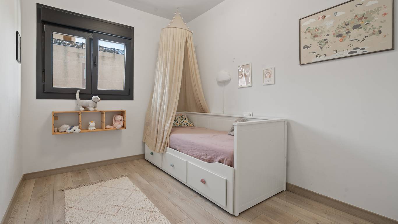 The bedrooms, bright and generous in size, include built-in wardrobes and high-quality finishes. Two of the rooms also have direct access to the upper terrace.