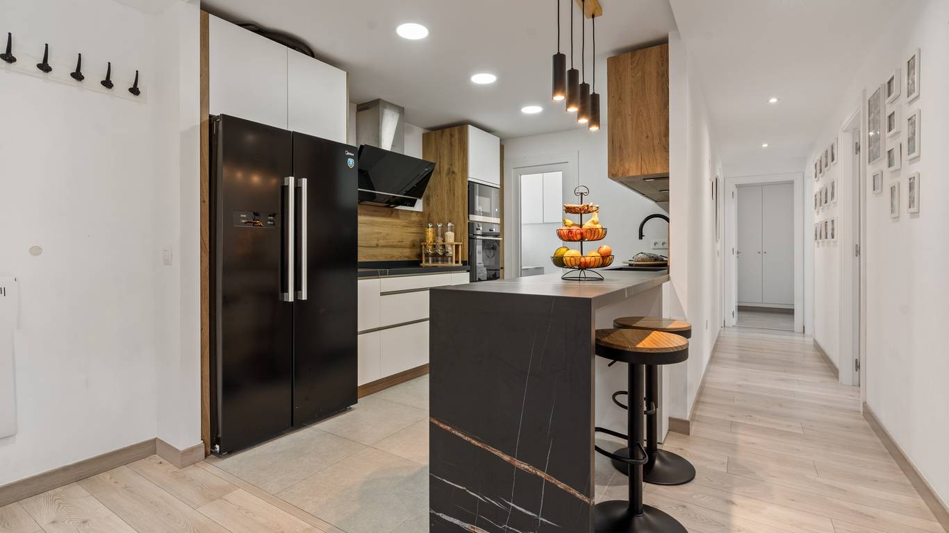 The open-plan kitchen, designed by Schmidt Cocinas, perfectly combines style and functionality, featuring top-brand appliances and the innovative Quooker system, which provides filtered cold water, 100 C boiling water, and sparkling water all from the same tap.