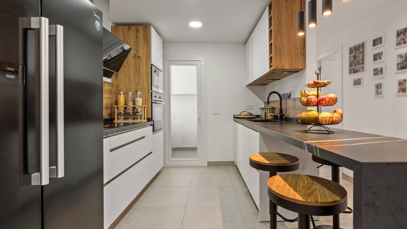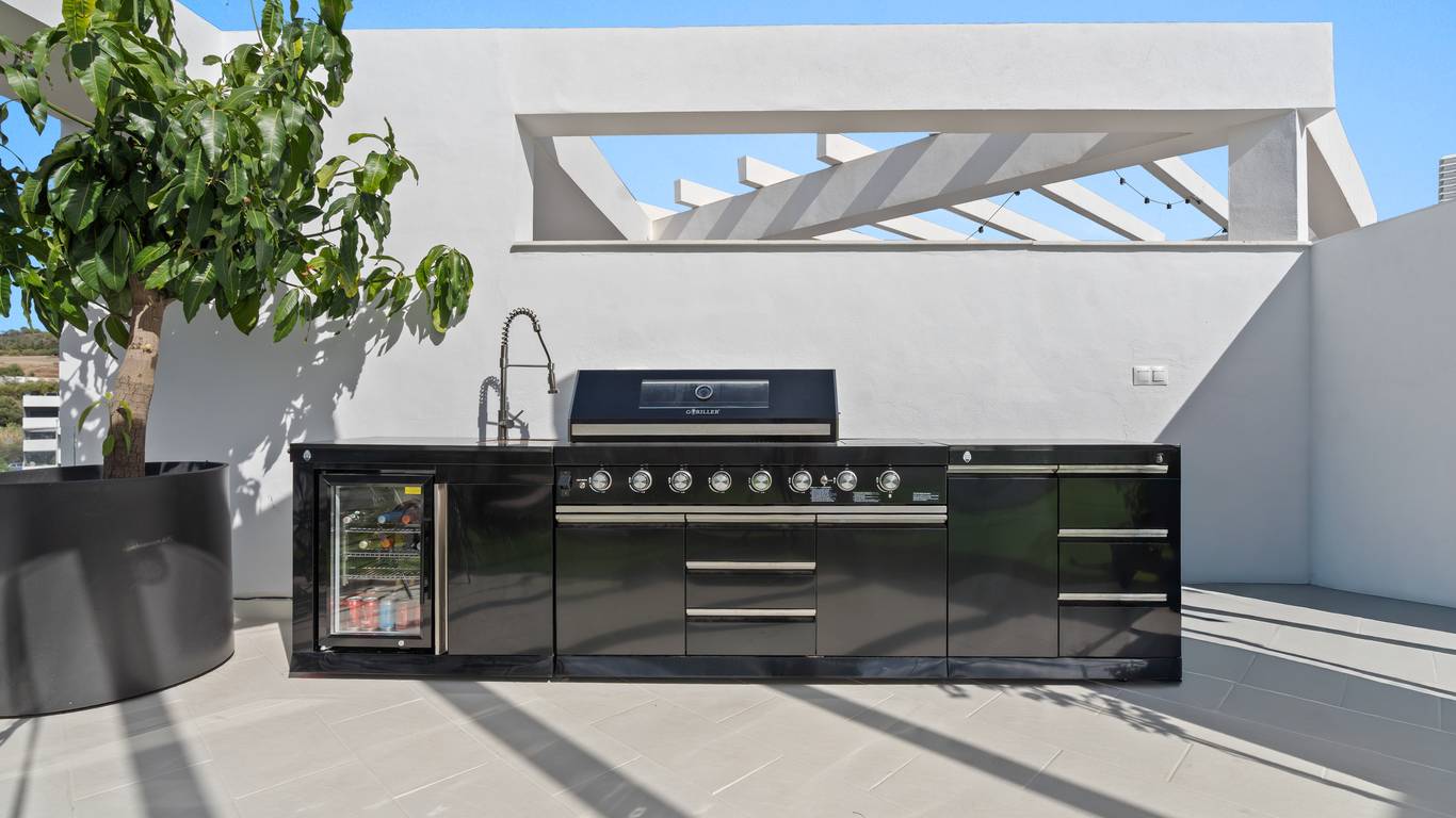 On the upper floor, the soul of the home is revealed: a large private rooftop terrace, designed to fully embrace the Mediterranean lifestyle. This space features a German-made Goriller outdoor kitchen, fully equipped with a sink, refrigerator, and an impressive six-burner grill with a motorized rotisserie. The terrace opens in every direction, offering views of the sea, the mountains, and Esteponas white rooftops. Its a space created for both relaxation and entertaining, where every sunset becomes a special moment. It includes retractable awnings, automatic irrigation for plants, solar video surveillance, and direct access from two bedrooms, seamlessly integrating outdoor and indoor living.